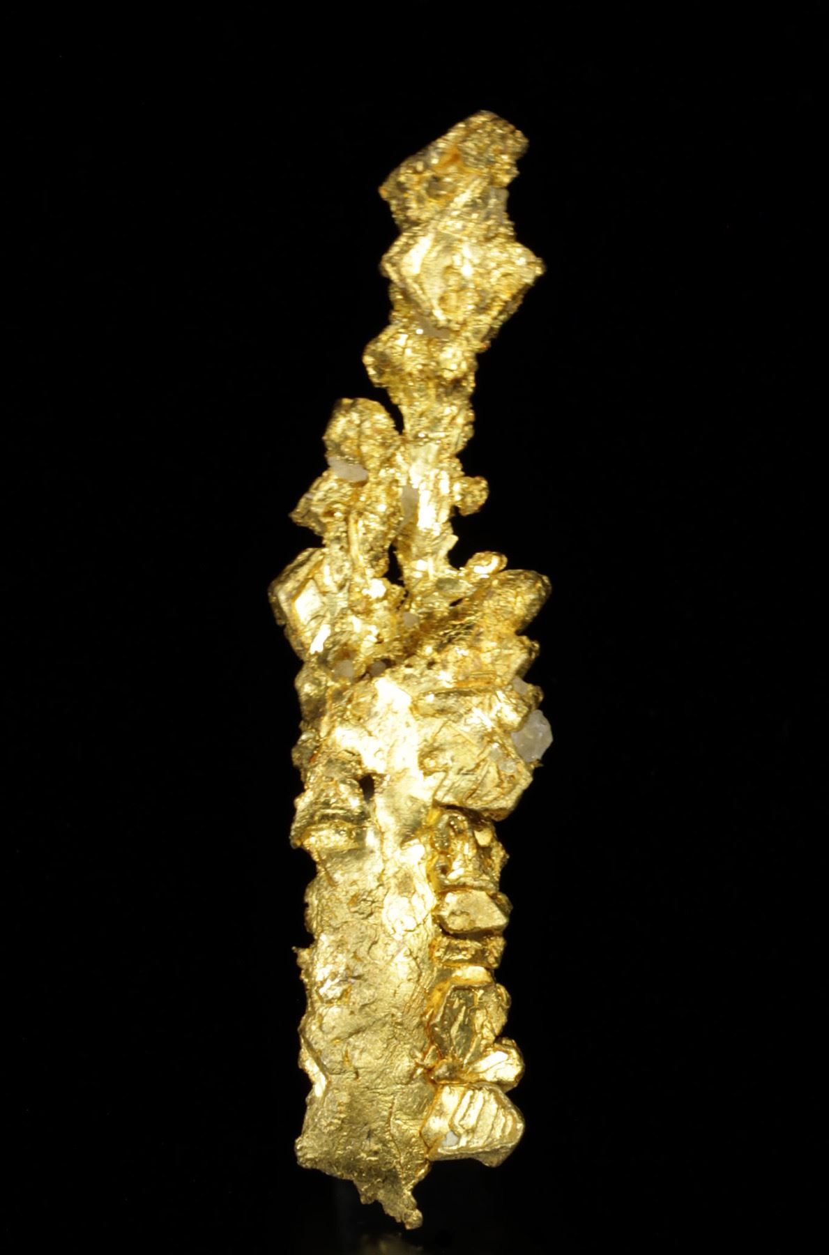 This specimen demonstrates why crystallized gold specimens from the huge, open-pit Round Mountain Mine so highly prized by mineral collectors. Round Mountain gold specimens exhibit brilliant surface luster, incredibly sharp individual gold crystals and a wide variety of crystal habits. Active exploration and recovery of crystallized native gold specimens at the Round Mountain Mine has come to an end, all of the gold "ore" is going to the smelter now ... crystallized gold "treasures" such as this piece will become much harder for collectors to find in the years ahead. Dimensions (cm): 4.8 H x 1 W x 0.3 D. 3.9 grams. Location: Round Mountain Mine, Round Mountain, Round Mountain District, Toquima Range, Nye Co., Nevada, USA Date: City: Nye County State: Nevada HWAC# 53116