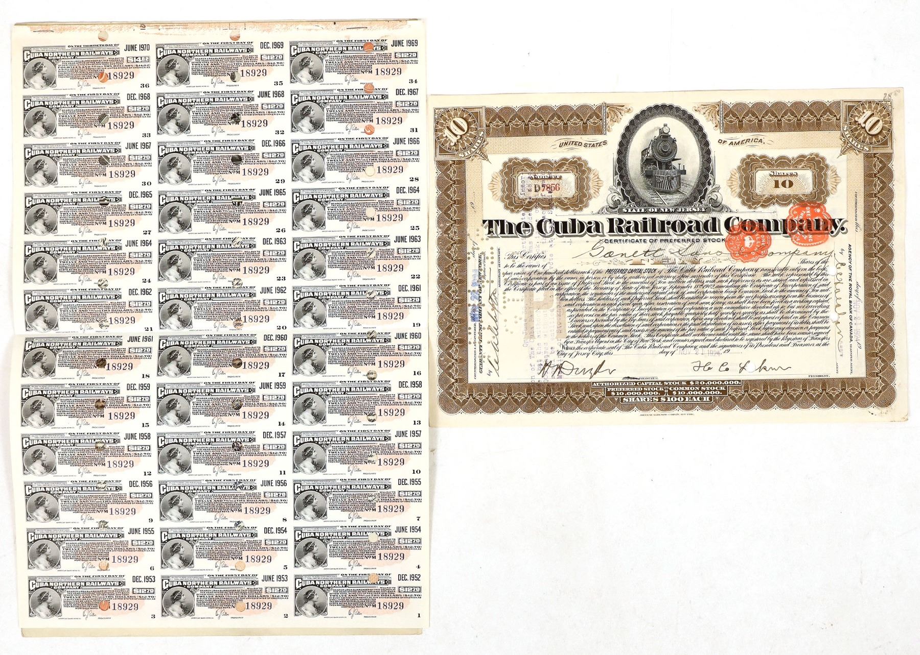 Two Certificates. 1. The Cuba Railroad Company , Inc. New Jersey, I/C, issued Nov. 1924, 10 shares @ $100 ea. Signed by president. Brn border "PREFERRED" brn underprint. Two embossed revenue stamps, vignette: frontal view of locomotive under steam. American BNC printer. 2. Very attractive cert. Cuba Northern Railways Co., , I/C, issued June 1927, $1000, 5 1/2 %, Gold Bearer Bond due 1942. Orange border, "GOLD" wht letters in field of orange underprint. Three vignettes at top: left cattle plowing can field, top center engineer oiling, right train cars being loaded. All coupons attached w/vignette of allegorical female profile. American BNC printer. Both are EF