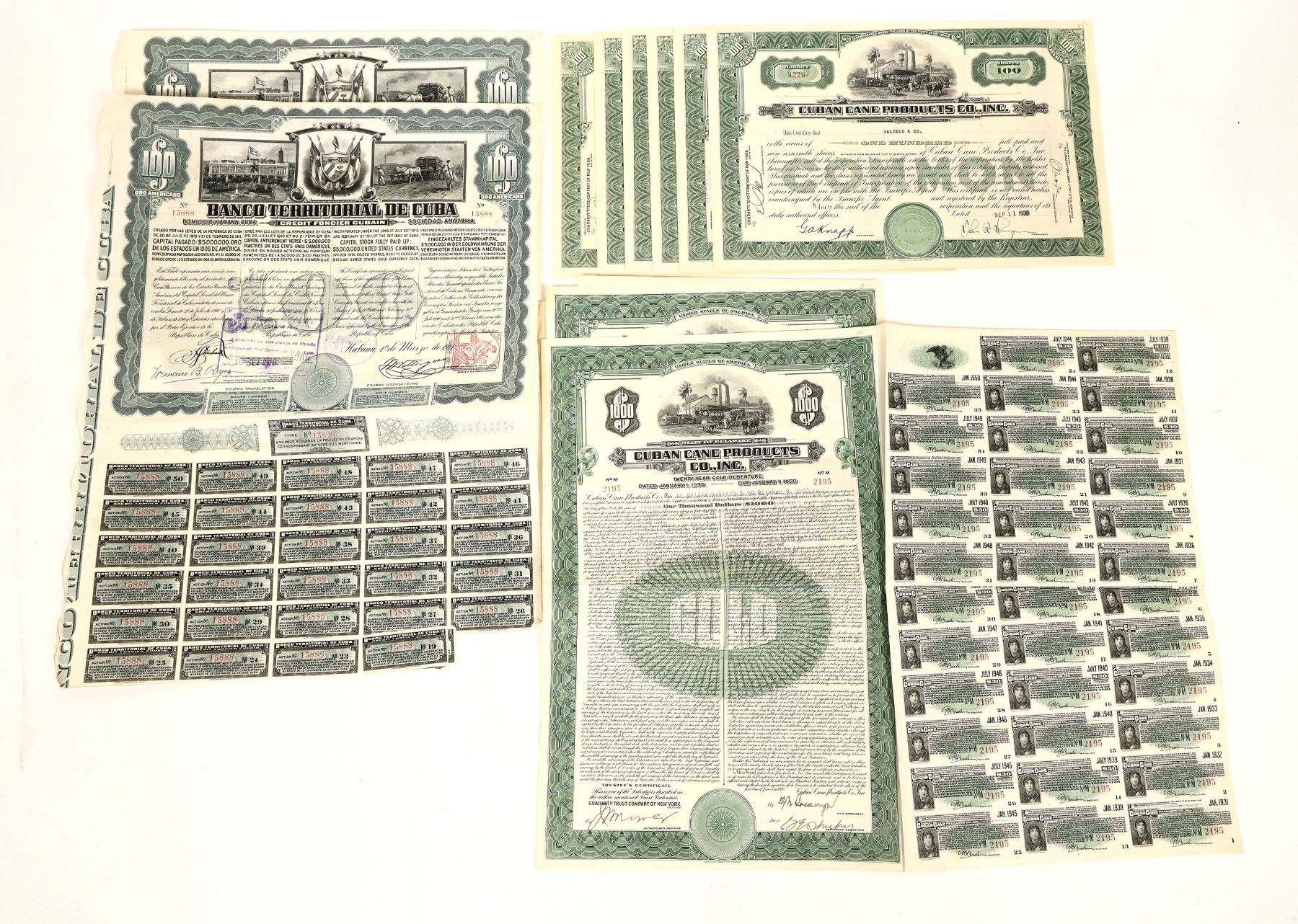 Lot of 11. 1. I/U, Three Banco Territorial De Cuba, $100 gold certificate. with some coupons attached. Three great vignettes, in exc. cond. American BNC printer. 2. I/U, Two Cuban Cane Products Co, Inc. $1000 gold bearer bond dues 1950. Coupons attached, vignette of can factory, exc. cond. American BNC printer. 3. I/U, six Cuban Cane Products CO. Inc. stock, 100 shares without par value, vignette of cane processing plant, American BNC printer.