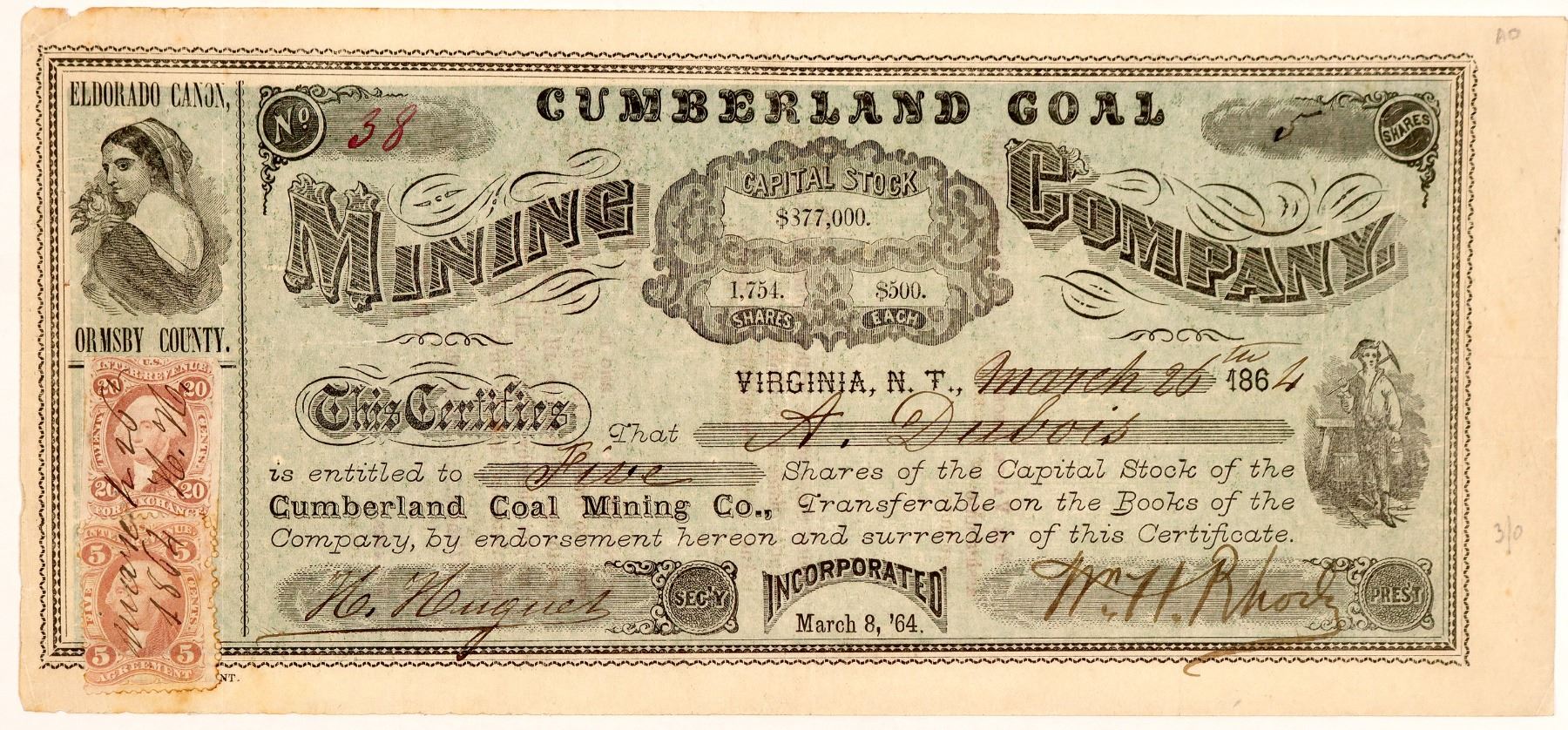 Rare Nevada Territory coal mining! Eldorado Canon, Ormsby County (printed at left). Inc. March 8th, 1864. No. 38, issued for five shares to A. Dubois on March 26th, 1864 in Virginia, N.T. Signed by president W.R. Rhodes and secretary H. Hugert. Not cancelled. Black border and print on green background. Two allegorical vignettes. Fancy title. Enterprise Print (covered by stamp). One 20 and one 5 cent revenue stamps attached on the left. Pinholes, folds, wear to edges. 4.5 x 10" Listed in Collins 1864 Comstock directory with Hugert as secretary. Rhodes is also listed as the secretary for Centreville Mining Company. There was also a Cumberland Coal Mining Company in Healdsburg, California in the 1860s. Eldorado Canyon is in the Pine Nut Mountains between Carson City and Silver City of Dayton. Coal mining was done in this canyon as early as the early 1860's. ["Nevada Heartland" by Ansari] Ken Prag Collection