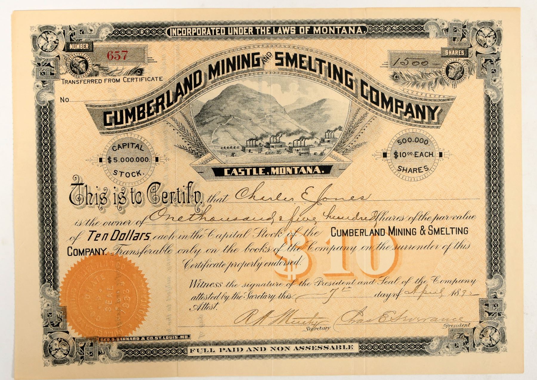 Cumberland Mining & Smelting Company Stock Certificate, Castle, Montana, 1892 [197924]