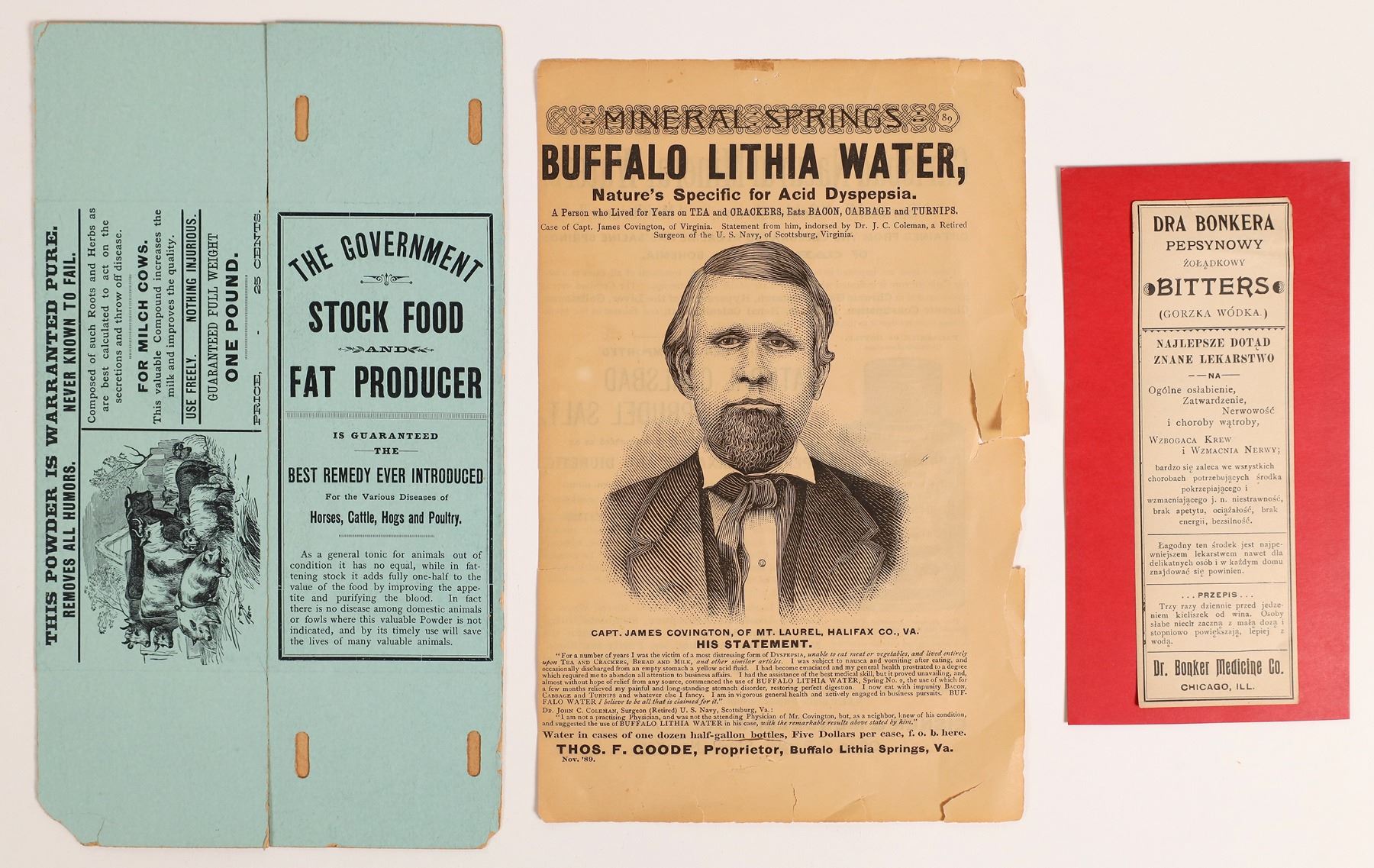 Dr. Bonker Medicine, Chicago, Ill., Bitters label with foreign writing 6.5x2". Folded blue box, The Government Stock Food Fat Producer remedy, 9.5x6", 2 corner chips. 2 sided advertisement-Buffalo Lithia Water and Carlsbad Natural Mineral Waters, 9.75x6.5", top staple holes, edge chips, tears, creases. Please inspect.