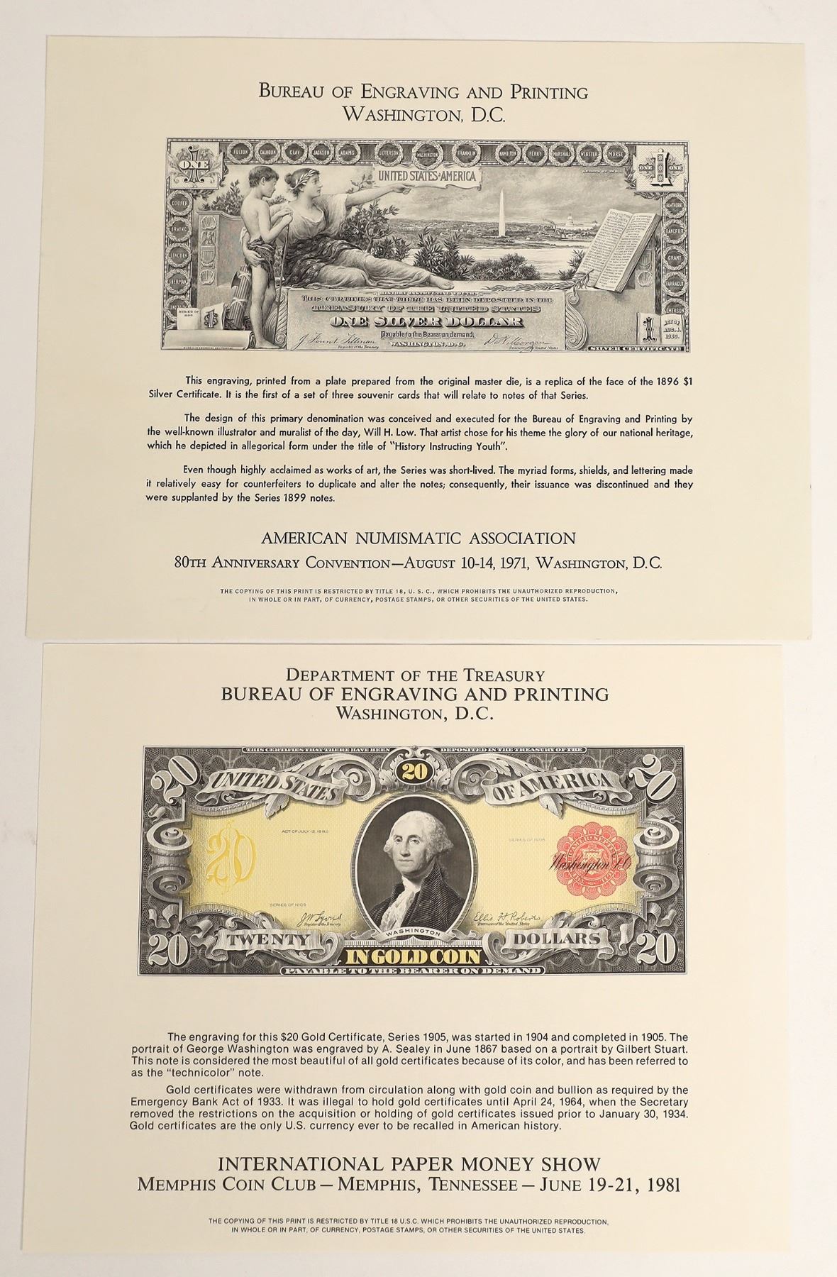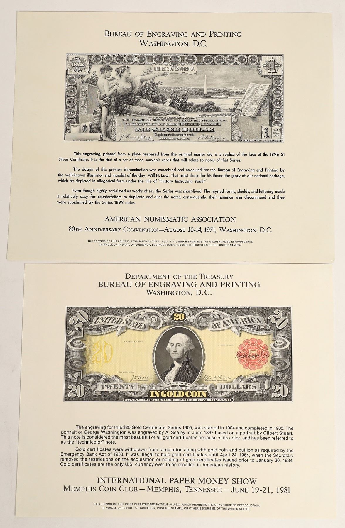 Two engravings issued by the Bureau of engraving and Printing of Washington D. C. at coin shows. 1) 1896 $1 Silver Certificate; issued at the ANA 80th Convention, 1971, Washington D.C. 2) 1905 $20 Gold Certificate. This note is considered the most beautiful of all gold certificates because of its color, and has been referred to as the "technicolor" note. Issued at the International Paper money Show, Memphis, 1981. Both engravings are 10 x 8 inches.