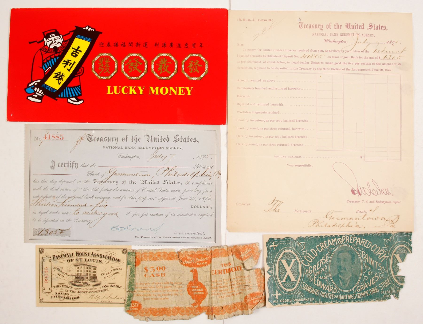 Lot of 6. Includes: "poker $1 bill" that has four 8s lined up in the serial number; two 1875 Treasury documents related to deposit of currency by Bank of Germantown in Philadelphia; Paschall House Association of St. Louis pictorial sweepstakes ticket; advertising piece designed to look like currency for Edward Graves Cold Cream & Prepared Cork Grease Paints, St. Louis; and a $5 cash reward slip for Freidman-Shelby Branch of the International Shoe Co.