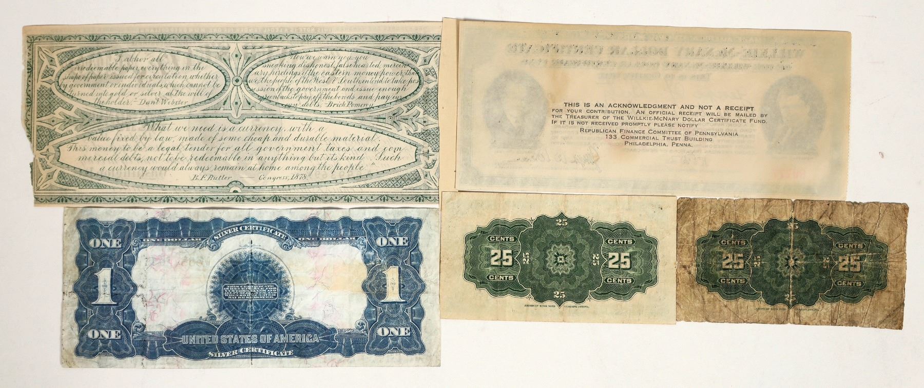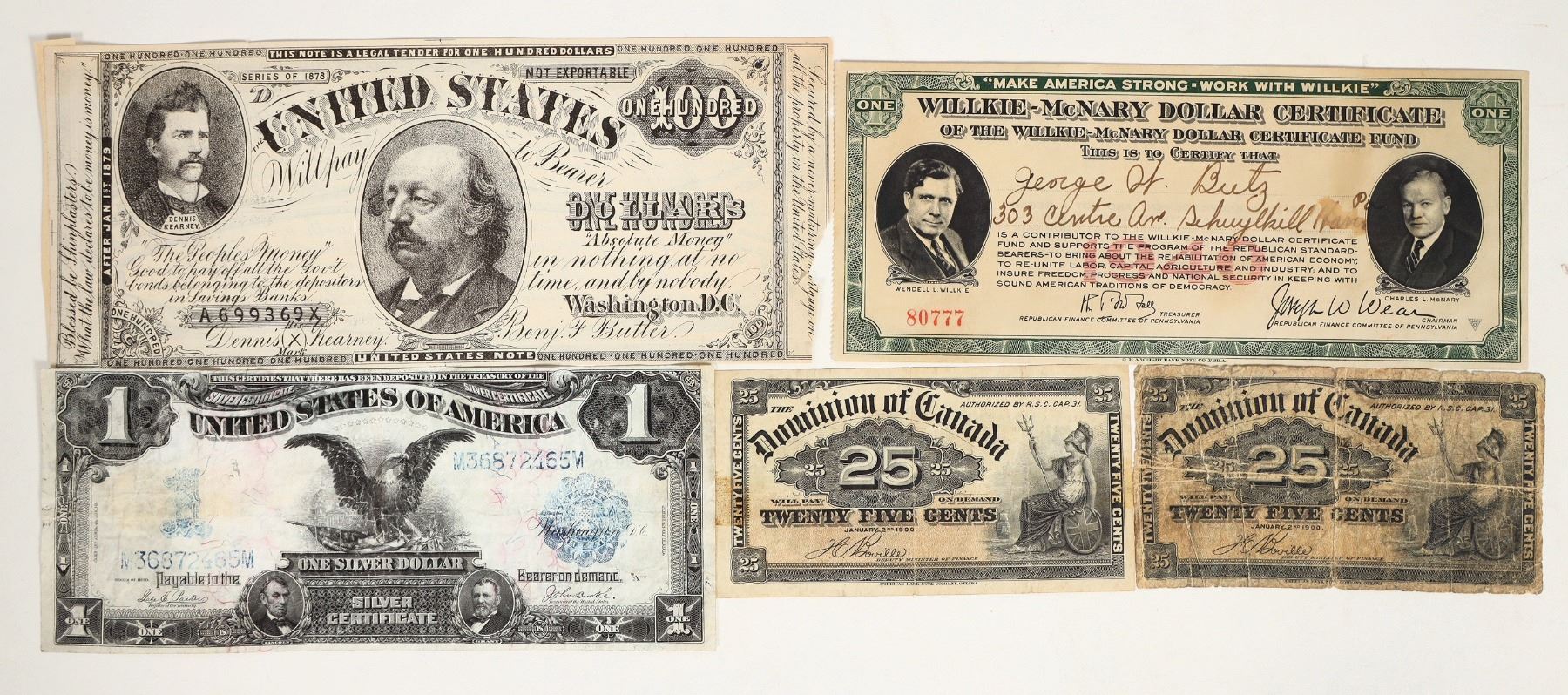 Five pieces of currency: 1) Fr. 232; Series of 1899 $1 Silver Certificate, large size; Vg-F. 2) Series of 1878 B. F. Butler note "The Peoples Money". Benjamin Butler was the Greenback Party candidate for president. 3) Wendell Willkie- Charles McNary Dollar Certificate. 4 & 5) 1900 Dominion of Canada twenty five cent notes; one about good, the other EF-AU.