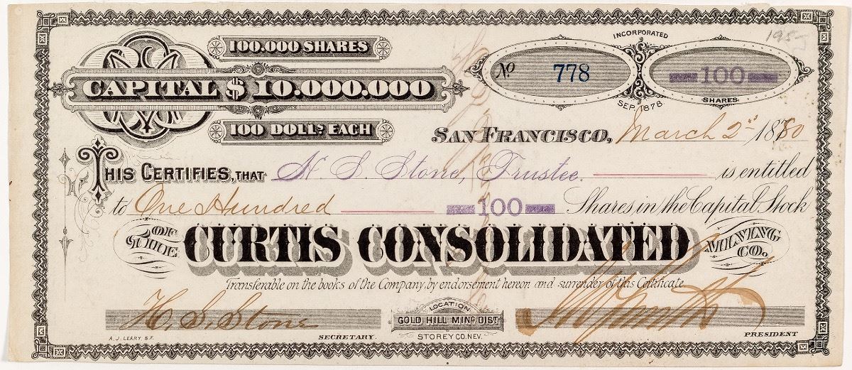 Stock no. 778. issued to H. S. Stone, Trustee for 100 shares, 1880. Signed by W. Smith (?), president and H. S. Stone, secretary. Curtis Consolidated Mining Co. Incorporated in 1878. Nevada bullion production for 1878 peaked at $44,570,549 for the year. A year later, some Nevada mining districts began declining, but new discoveries were still being made. Deep mining began on the Comstock with the connection of the Sutro tunnel to area mining works. (Prag Collection) City: Gold Hill State: Nevada Date: 1880 ID# 31576