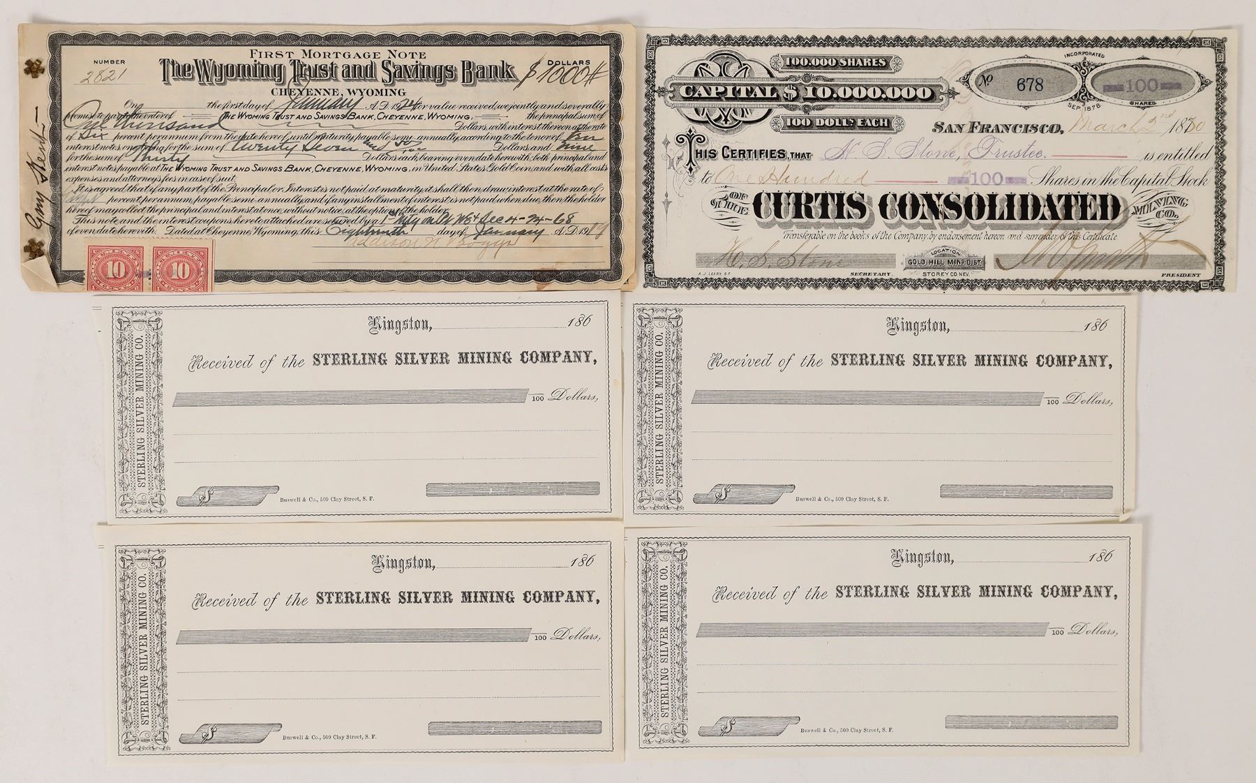 Five pieces of Western financial paper: 1) 1870 Curtis Consolidated Mining Company stock certificate for 100 shares issued to H. S. Stone, located in the Gold Hill Mining District of Storey County Nevada. 2) 1919 First Mortgage Note from The Wyoming Trust and Savings Bank of Cheyenne with two revenue stamps attached. 3-5) three unissued receipts of the Sterling Silver Mining Company of Kingston 186_. Printed by Buswell & Co., 509 Clay Street, S. F. In 1865, Kingston got a post office and a 20-stamp mill, the Sterling Mill, was erected on the hillside above the settlement. The mines declined in just a few years and by 1869 the mills were silent and the Kingston post office closed.
