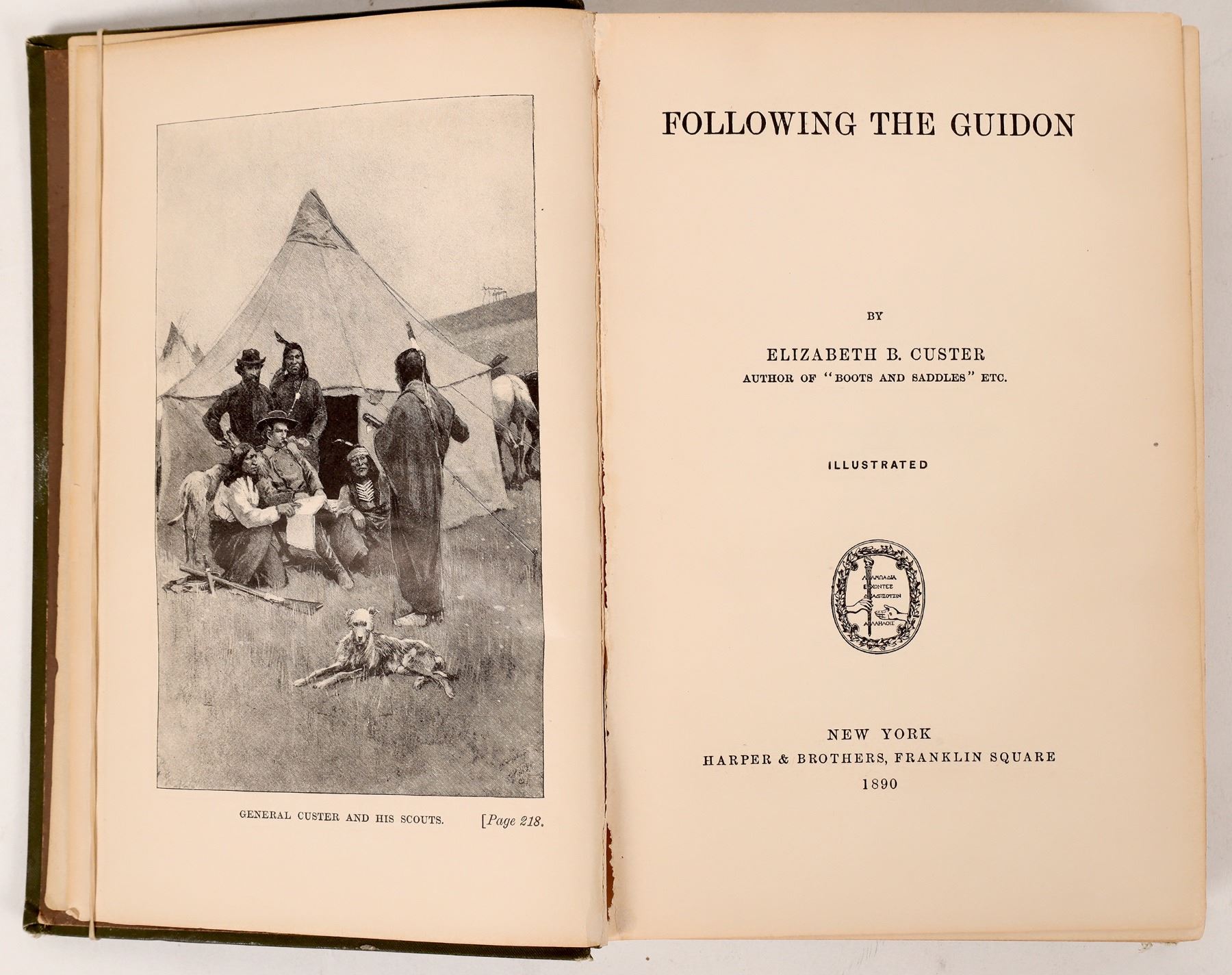 "Following the Guidon" is an account written by Elizabeth "Libby" Custer about her husband George Armstrong Custer and his campaigns during the Indian Wars. The copyright is 1890 and book boards show some separation from spine. Please see photos for more details. South Dakota 1890
