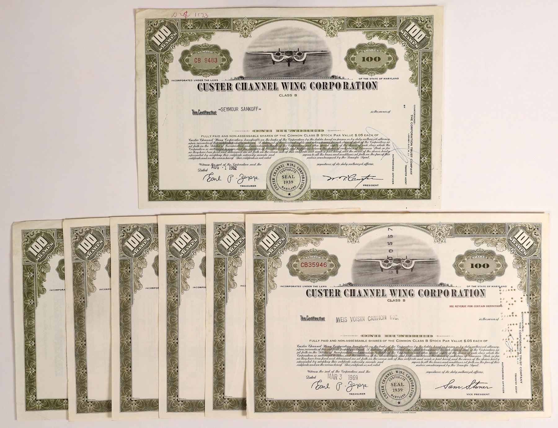 Lot of 7 issued and cancelled stocks, 1962-1969. Two not cancelled. Inc. in Maryland, 1939. Identical design: green border, black print, and photo vignette of an airplane. Printed by Security Banknote and Security-Columbian Banknote. Willard Custer founded this company that built experimental aircraft designs of the 1940s and 1950s incorporating a half-barrel shaped section to each wing. Aircraft included the CCW-1, CCW-2, and CCW-5. Maryland 1962-69