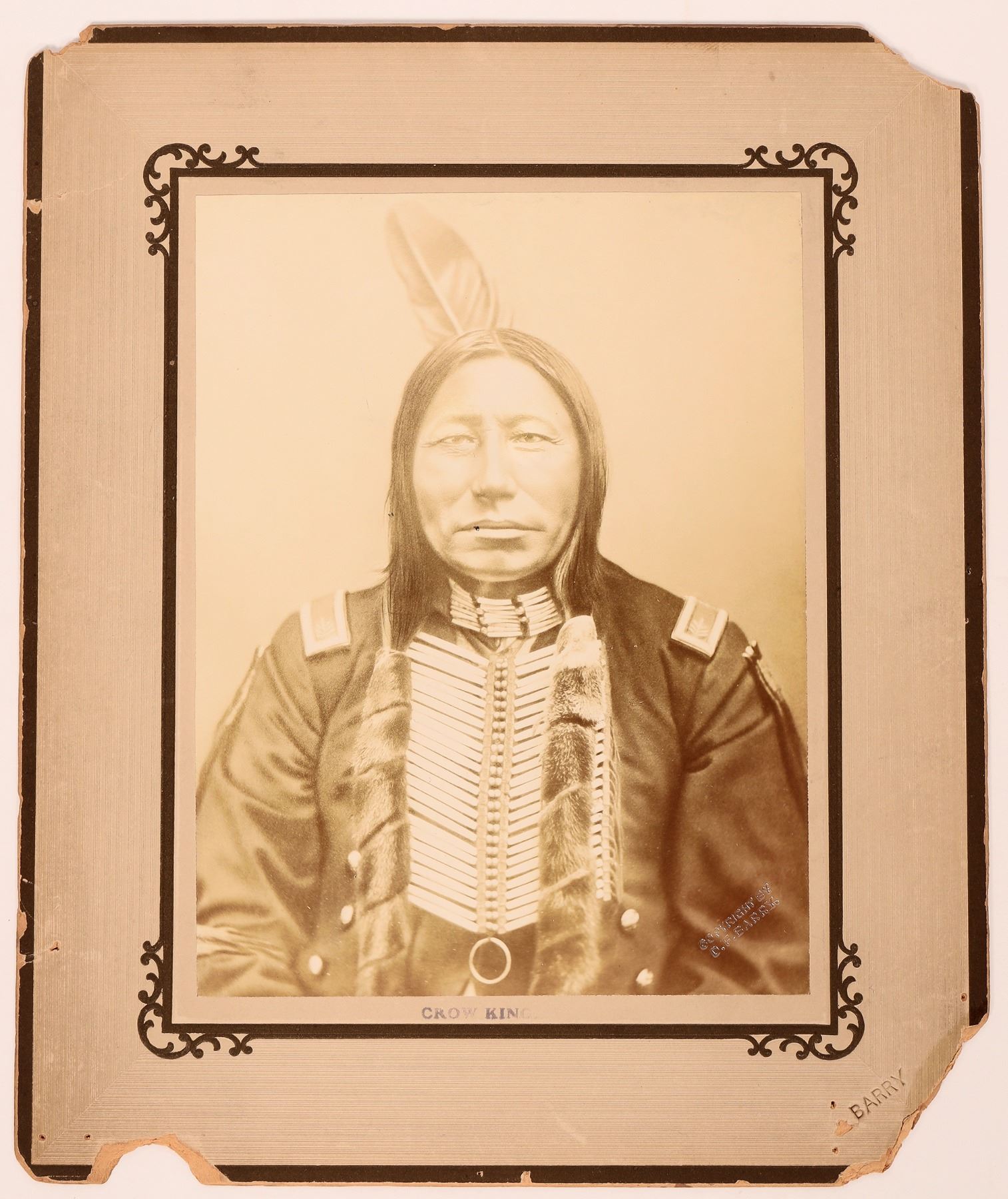 This photo of Crow King AKA Kangi Yatapi, is 6.25 in. X 8.25 in. by D.F. Barry on a hardback paper. The backing shows missing corners and pin holes, however, the photo itself is in excellent condition. A striking pose from a warrior wearing a cavalry uniform jacket. His hair is wrapped in otter skins and wearing a bird bone choker. This man was proud that he made a pass at Custer's unit pushing them into a trap from below with Crazy Horse and Gall. In Barry's handwriting on the reverse "Made the dashing charge in the Custer Fight". Please see photo for details.
