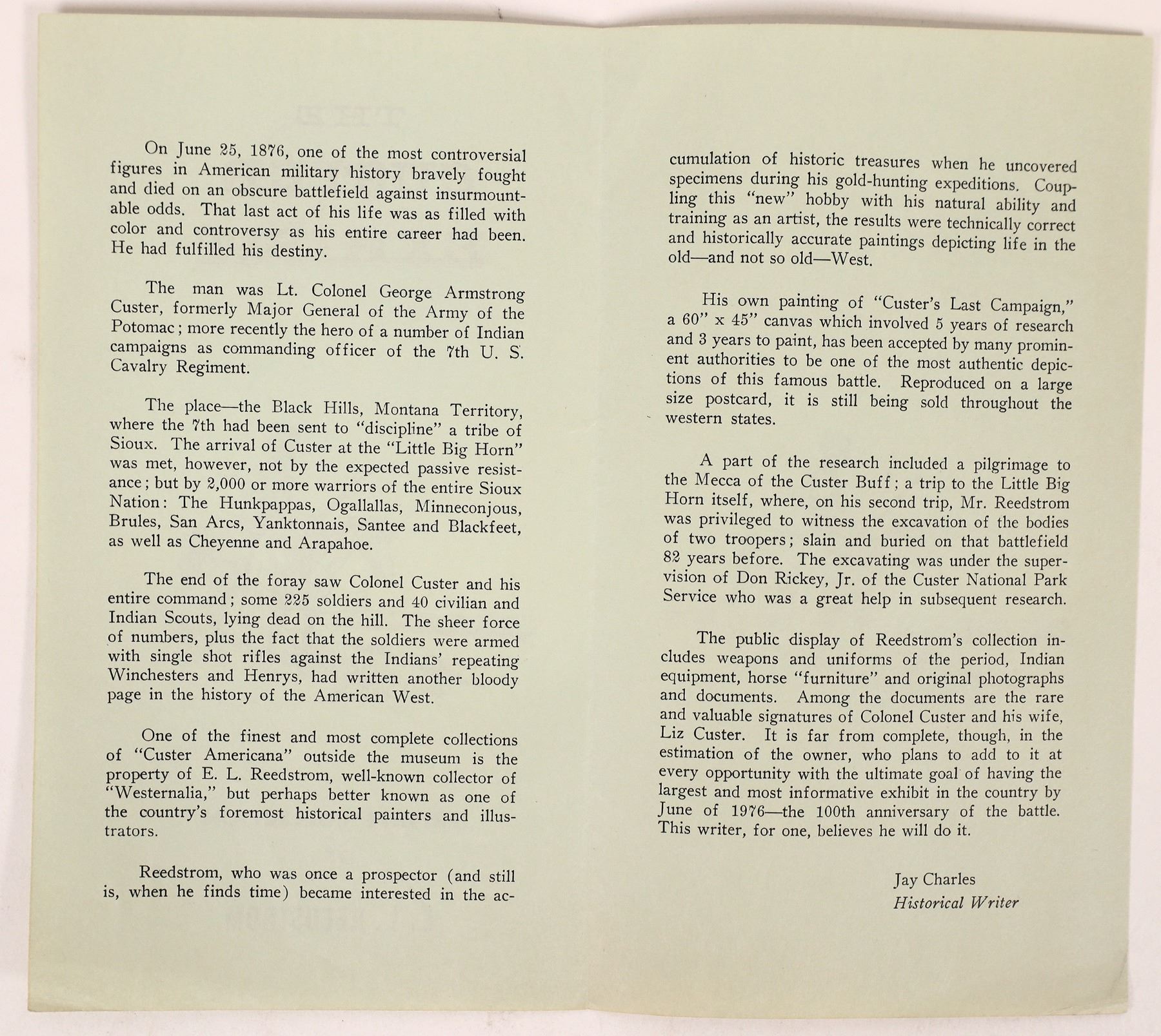 The Custer Exhibit, Private Collection of E L Reedstrom 4pp brochure. Reedstrom was a major Custer collector.