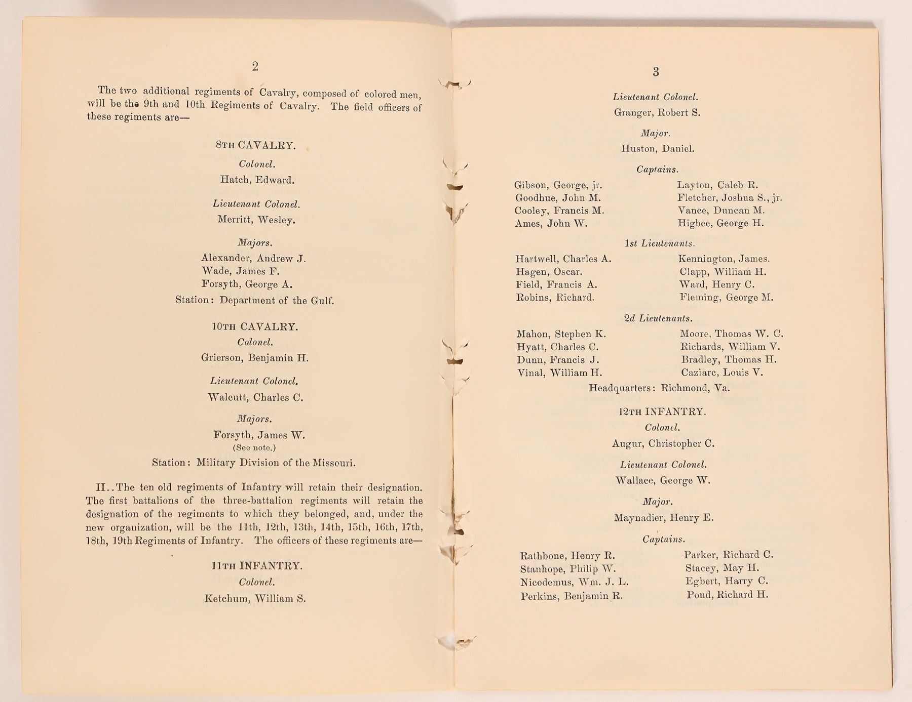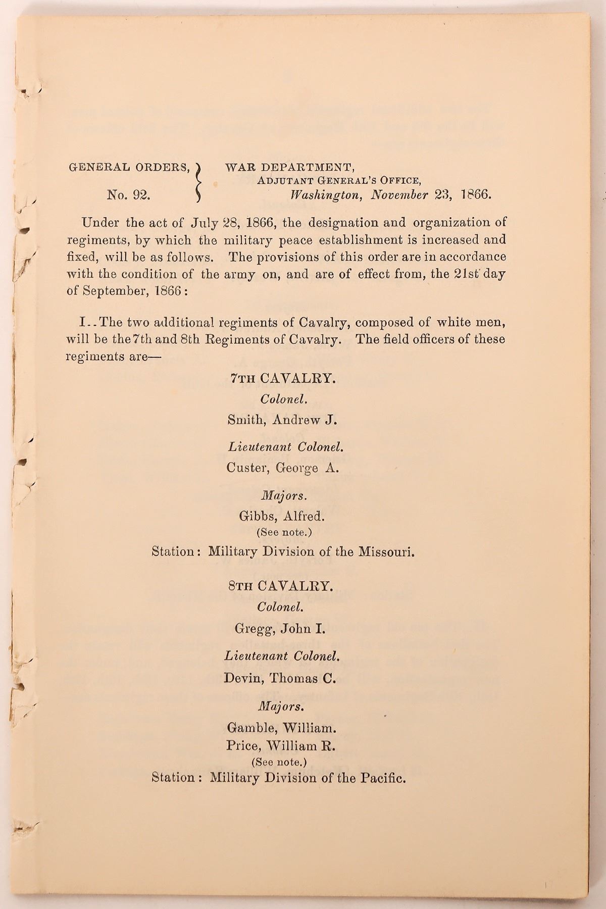 This unbound general orders #92 dated July, 1866 outlines the formation of the 7th Cavalry with Colonel George Armstrong Custer in Command. 29 pages at 4.5 in. X 7 in.