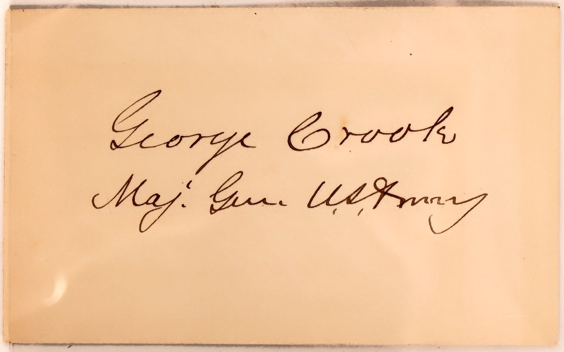 This cut-square signature is of Major General George Crook United States Army; a graduate of West Point class of 1852. A career soldier who fought in the Civil War and later the Indian Wars. He was responsible the capture and surrender of Geronimo. Nicknamed by the Apache as: "Crook Natan Lupan". The literal translation is: Crook Wolf Warrior. Bold clear signature excellent condition.