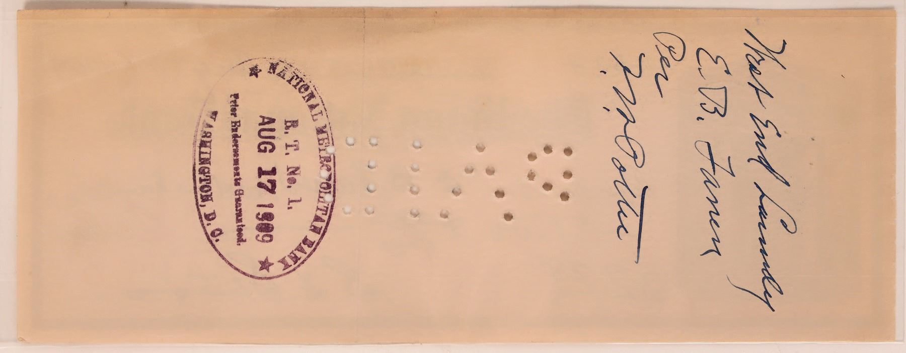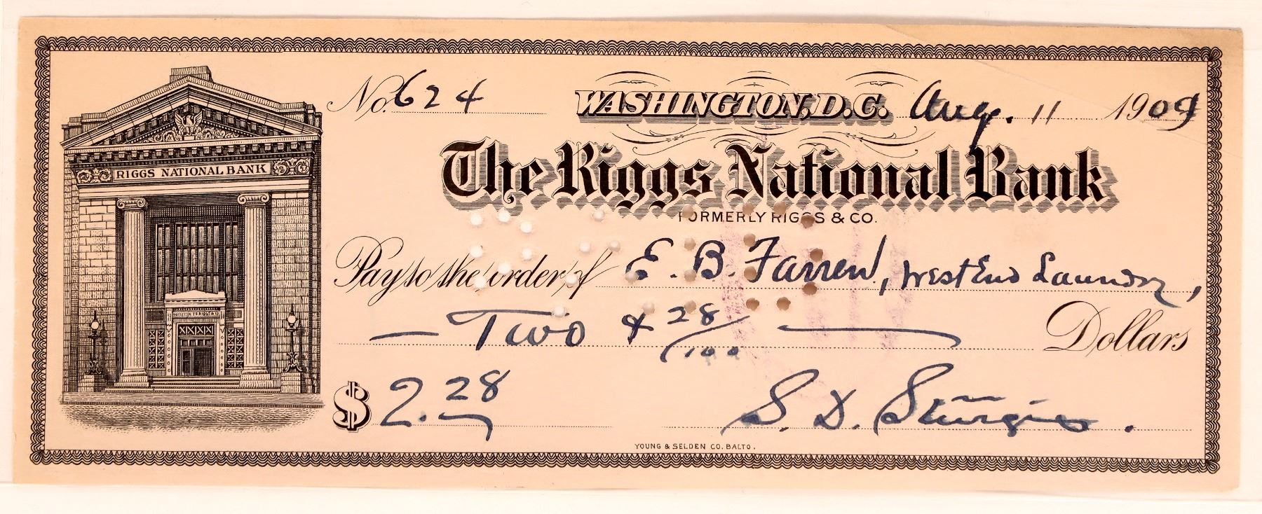 This is a canceled check written by S.D. Sturgis in 1909; a career soldier and a graduate of the famous class of 1846 of which many grads. would later fight for the union or the confederacy. He became Commander of the 7th Cavalry in 1869 but was in St. Louis at the time of the Battle of the Little Big Horn. The town of Sturgis, South Dakota is named after him.