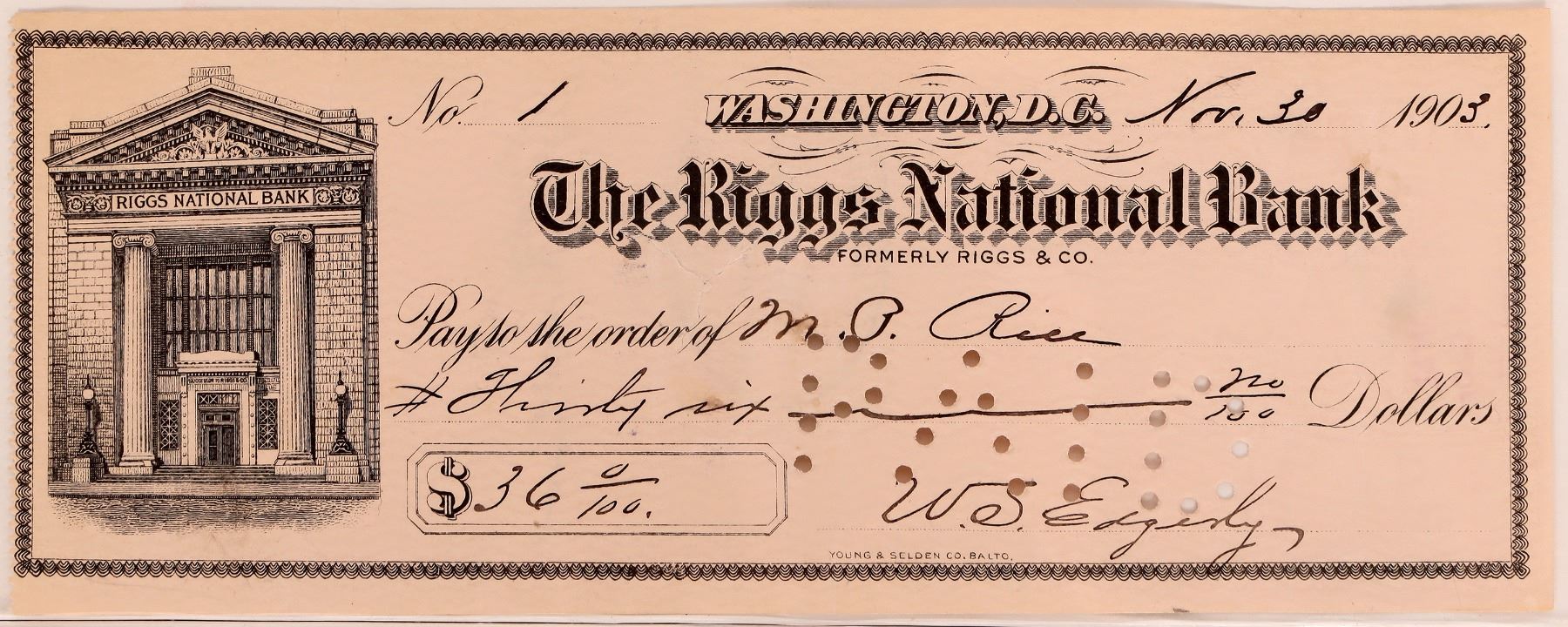 This is a cancelled check written by Winfield Scott Edgerly of the 7th Cavalry, dated 1903. Winfield Scott Edgerly, named after a Revolutionary War colonel and a graduate of West Point in 1870, was promoted to 1st Lt. the day before the Battle of The Little Big Horn making him second in command of Company D. Edgerly would survive the battle by joining Benteen's command. As 1st Lieutenant his duties included regimental quartermaster. One can only imagine what he witnessed on July 27 to discover Custer's wasted regiment. He went on as Commander of Company G 7th Cavalry to fight the Battle/Massacre of Wounded Knee (1890), now buried in Arlington National Cemetery.