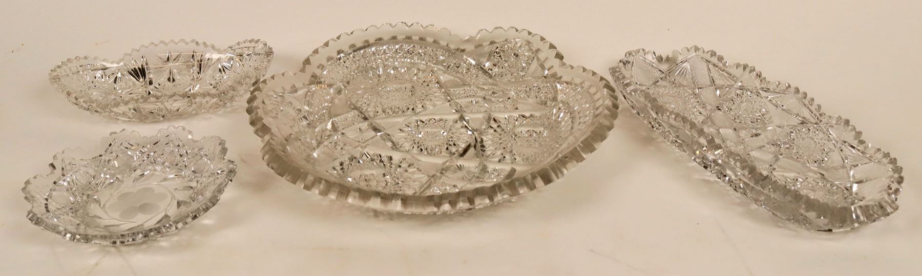 Four exquisite pieces made of cut crystal, including a relish dish and two candy dishes or, whatever you want to put in them. The relish dish measures 11"x 5", while the candy dishes measure 8"x 5" and the circular dish measures 6"across. The large, what appears to be a deviled egg plate, measures 12" across. Pieces have no visible chips or cracks. See photos for more detail and condition.
