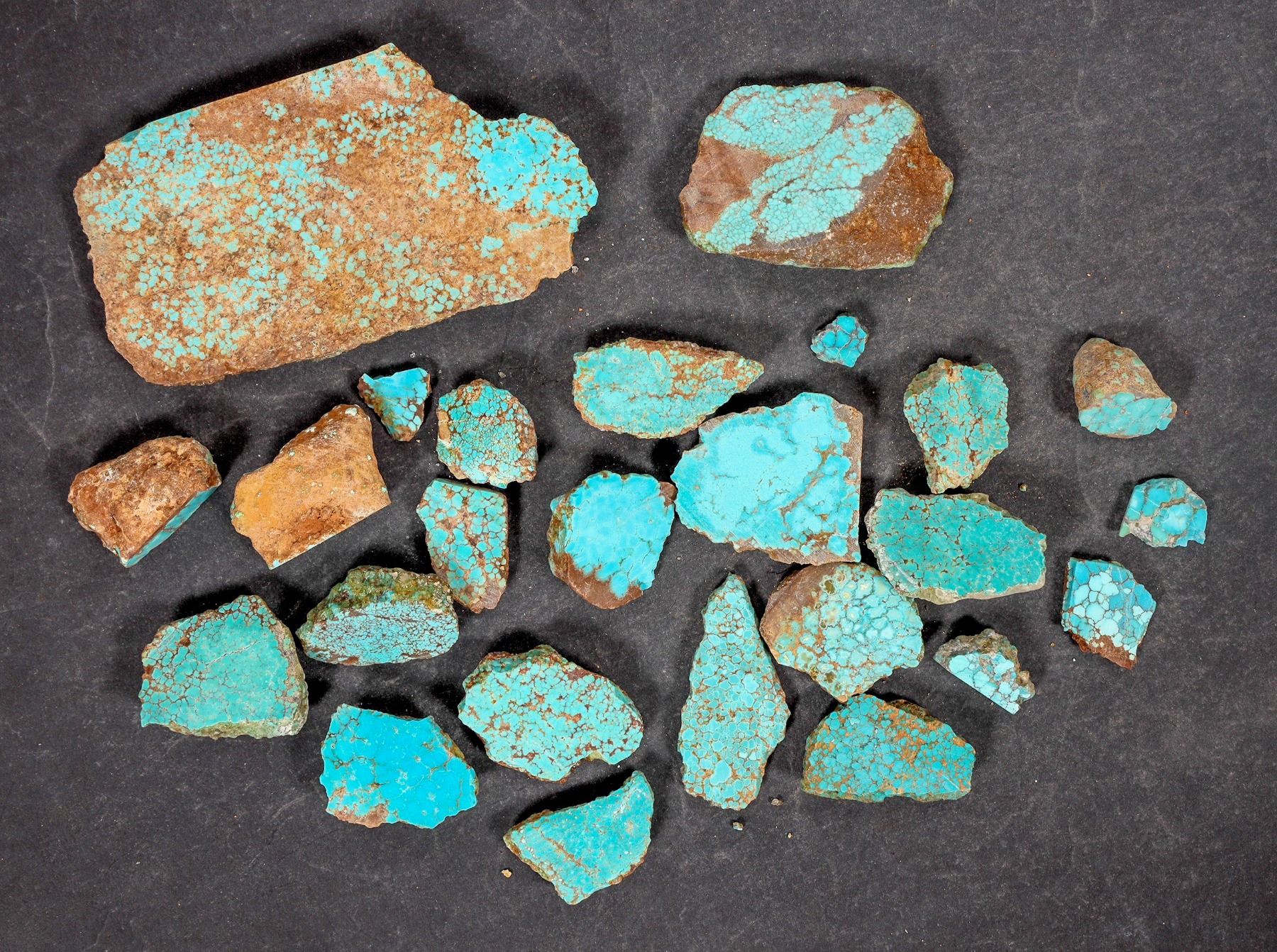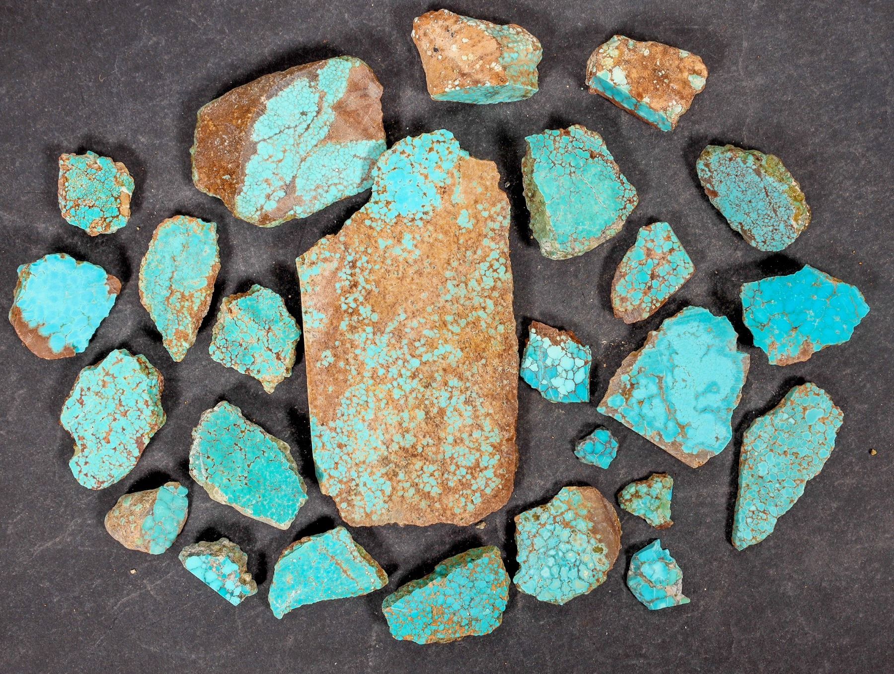 Rough turquoise - small-medium cut pieces/slabs, mostly spiderweb turquoise, hand-selected for color. Brilliant, medium-blue pieces. Mostly treated. Approximate weight 11.9 ounces. Pieces in the lot range from around .75" to 4.25" in length. This turquoise originates from the No. 8 turquoise mine of Cortez, Nevada, often considered one of the top turquoise mines in the world. It was previously in storage for 35 years.