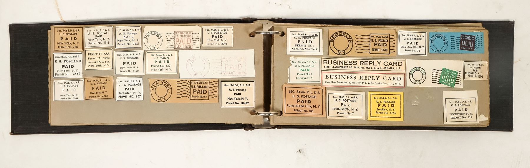 An album containing approximately 260 pieces of cut square postage mounted on cardstock pages and an additional group of cut squares in an envelope. Squares date from the mid-1900s. They originate from a variety of cities around the United States; all squares list location and permit number. Album has some wear on spine but is in relatively good condition.
