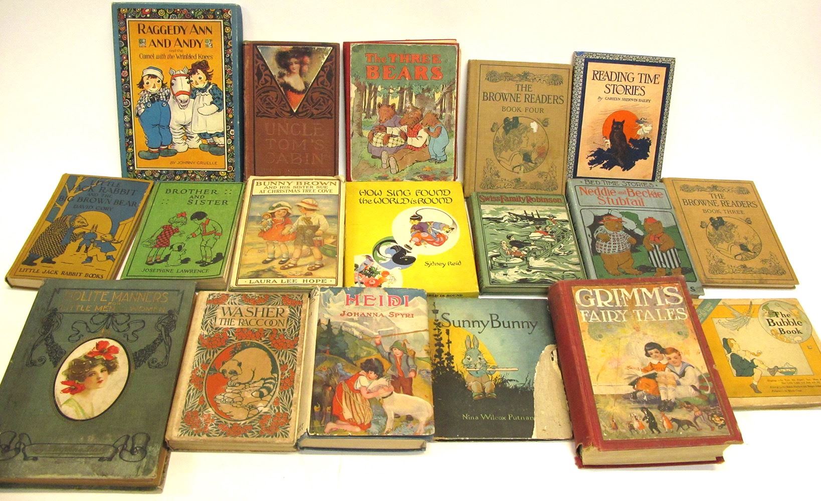 Lot of 18. Includes: Polite Manners for Little Men and Women, Uncle Tom's Cabin, Raggedy Ann and Andy, The Browne Readers Book Three and Four, The Three Bears, Grimm's Fairy Tales, Washer the Raccoon, Little Jack Rabbit, and more. Please inspect. Out of the Ayer Family Estate (Reno & Virginia City, Nevada). Date: Location: HWAC# 55579