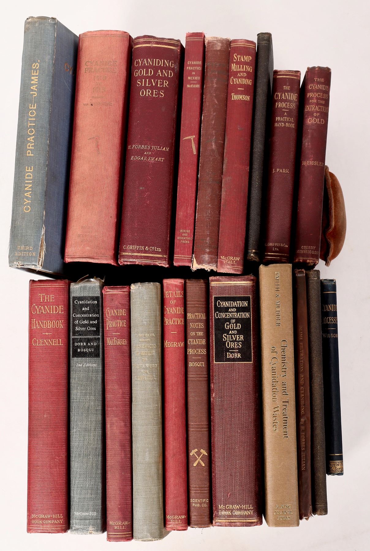 The Cyanide Process its Practical Application and Economical Results, by Scheidel, 1894, hardcover black textured, pp. 129 well illustrated with pull-outs, rounded corners; The Cyanide Process for the Extraction of Gold and Its Practical Application on the Withwatersrand Goldfields and Elsewhere by Eissler, 1898, second edition enlarged, hardcover red fabric scuffed binding, rounded corners, pp. 137 well illustrated and several pull-outs; Cyanide Processes by E.B. Wilson, first edition 1896, hardcover blue cloth very good condition with owners signature, pp. 116 foxed corners; Cyanide Practice by James, pp. 174, hardcover blue cloth foxed corners, loose flyleaf, owners signature 1901; Practical Notes of the Cyanide Process, by Bosqui (of Bodie, Cal.) 1901 second edition, hardcover brown embossed cover, pp.194 foxed corners, interesting photos and sketches; Recent Cyanide Practice by Rickard, first edition, 1907, pp. 334 hardcover red fabric, stained cover, worn binding good condition; The Cyanide Handbook by Clennell first edition-second impression, 1910, red fabric cover lightly stained, pp. 500, some photos and illustrations good condition; Text Book of Cyanide Practice by MacFarren, 1912 only edition, red fabric hardcover, cover lightly stained and sun faded, pp, 212, penciled notes, original owner's signature in front cover; Cyanide Practice by M.W. von Bernewitz 1910-1913, hardcover 1913, red cloth sun-faded binding pp.732; Cyanide Practice in Mexico by F. McCann, 1912, hardcover red cloth some soiling on the cover pp. 194, in english, great pull-out diagrams, minor tear in binding; The Cyanide Process its Practical Application and Economical Results by DR. A. Scheidel, E.M. 1894, hardcover dark blue cloth, pp. 133, well illustrated foxed corners, owners stamp inside front cover; Beneficio de Metales De Plata Y Oro por Cianuracion Por Ferdinand McCann, hardcover pale green cloth 1909, in spanish, first edition, rare find, great photography, pp. 354, foxed corners; The Cyanide Process of Gold Extraction by J. Park 1906, hardcover red cloth, minor staining wear on cover, pp.232, well illustrated; Cyaniding Gold & Silver Ores by Julian and Smart, hardcover red embossed cover, pp. 441 broken binding, foxed corner; Stamp Milling and Cyaniding by Thomson, first edition, 1915, hardcover red fabric, lightly stained cover, pp.246 well illustrated; Cysnidastion and Concentration of Gold and Silver Ored by Dorr, 1936, hardcover red fabric, first edition, pp. 452,owners mane inside cover very good condition; Details of Cyanide Practice by Megraw, 1914, first edition, pp. 211, first edition, red fabric hardcover stained, well illustrated; Cyanide and Concentration of Gold and SIlver Ores by Dorr and Bosqui, second edition, 1950, hardcover light blue fabric with clear cover applied, pp.501; The Chemistry and Treatment of Cyanide Wastes by Smith & Mudder, hardcover moss green fabric, pp. 331 , like new condition; Slime Filtration and Cyaniding by Julian for Chas. Butters & Co., hardcover brown fabric, pp. 58, not dated, as a sales information booklet, rounded corners. GO TO THE BOOKS SECTION OF THIS AUCTION FOR OTHER IMPORTANT MINING REFERENCES AND MINING-RELATED WORKS.