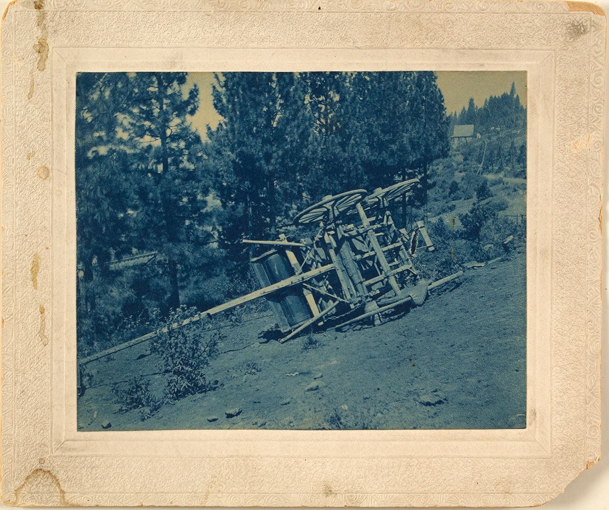 Nice cyanotype photo of wrecked stagecoach--Summer Stage. Mounted, board messy, but photo is good. City: Colfax State: California Date: hwac# 36126