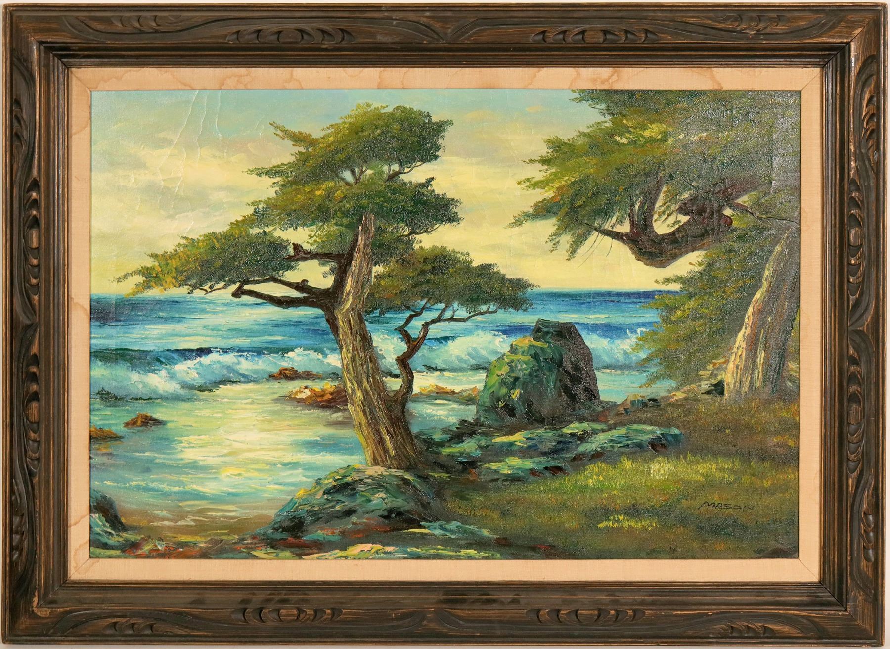 Beautifully painted oil on canvas by Mason (signed Mason). We have not been successful in finding info about the painter. Vivid colors of a California central coastal area. Ornate wood frame, 44" x 32", Linen over mat has water damage. Actual painting, 36" x 24".