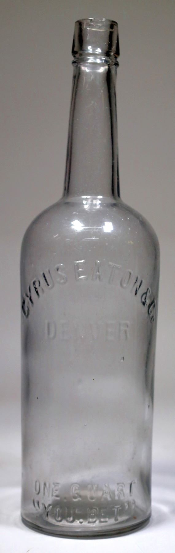 Preble W-41a. Clear glass, wiped top, one quart. Cyrus Eaton & Co / Denver / One Quart / "You Bet". 12 1/4". Horizontal crack in lip, a few surface abrasions and wear. Please inspect.