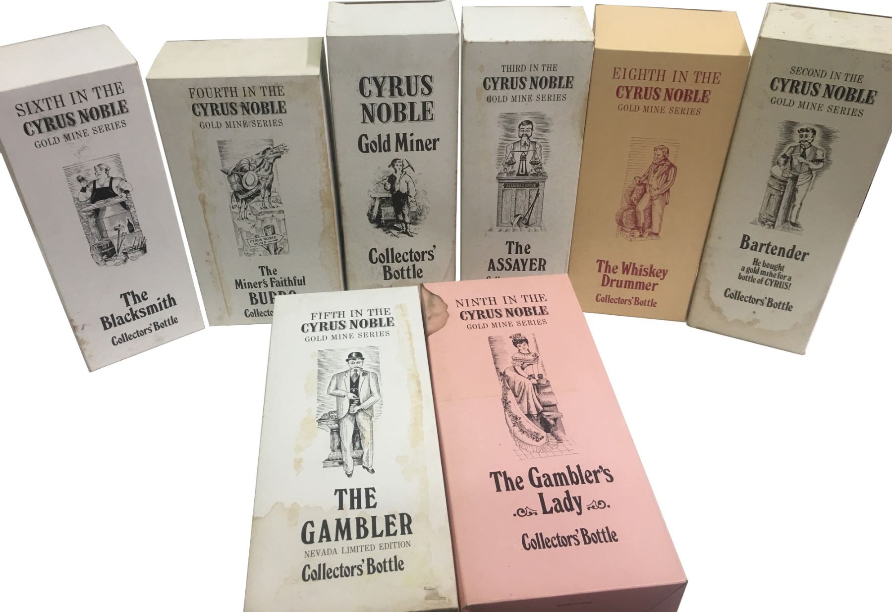 Set of 8 Cyrus Noble whiskey decanters from McGill Club in McGill, NV, new in boxes. Bartender, assayer, miner, blacksmith, gambler's lady, whiskey drummer, gambler, miner's faithful burro. May or may not contain original contents. See photo from HWAC lot 86445, bottles are identical