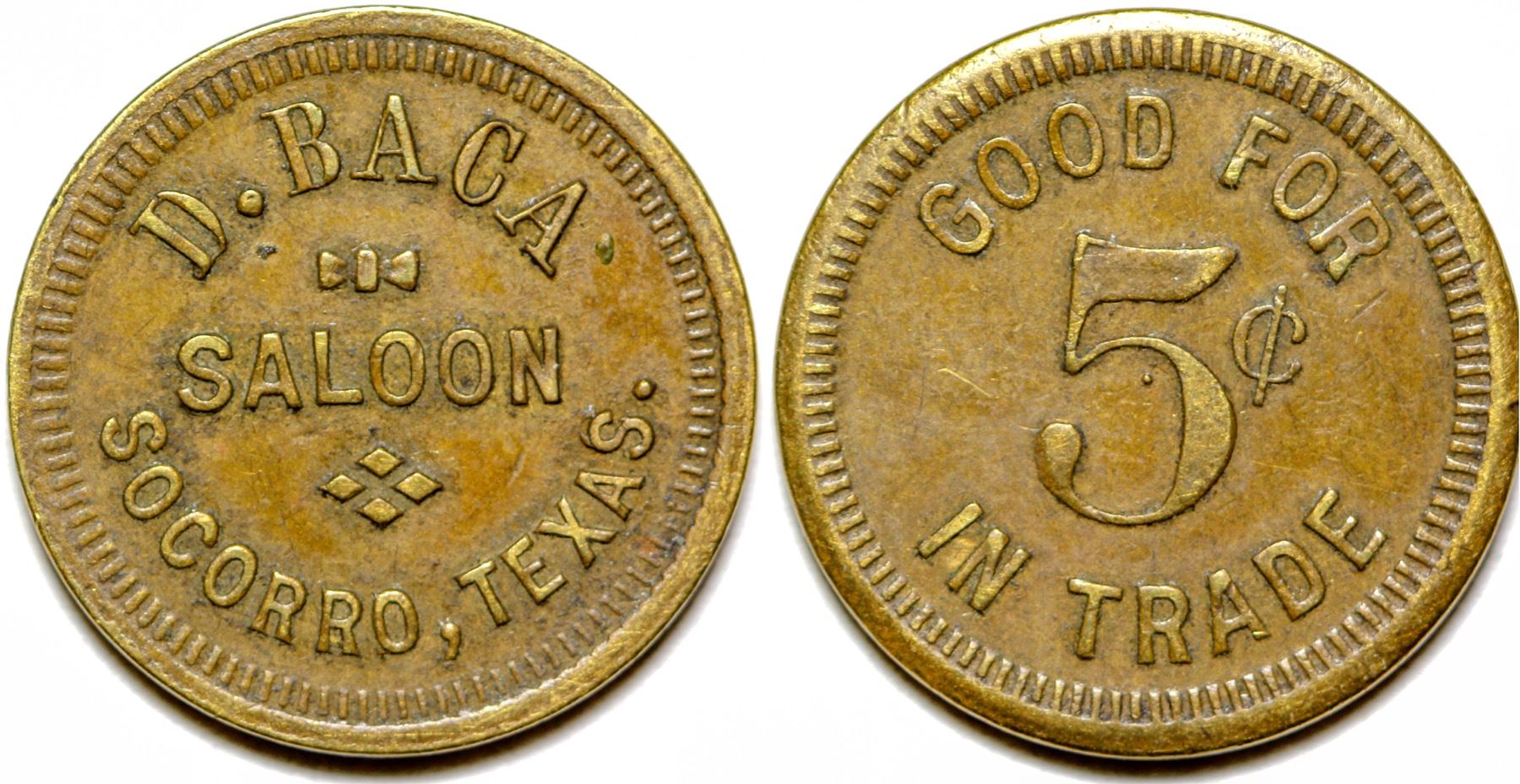 D. Baca Saloon // GF 5c IT. Rare Saloon token State: Texas City: Socorro Date: HWAC# 85308