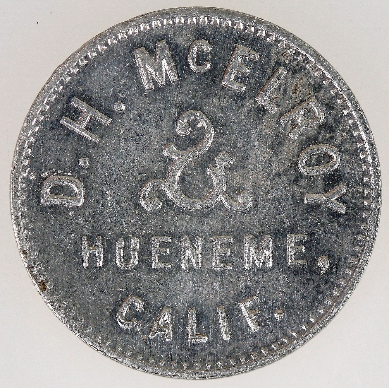 Rare Anillo restrike from the Ventura County town of Hueneme: D.H. McELROY / HUENEME, / CALIF. // (blank) (1968-69 Anillo restrike); Al., rd., 20 mm.