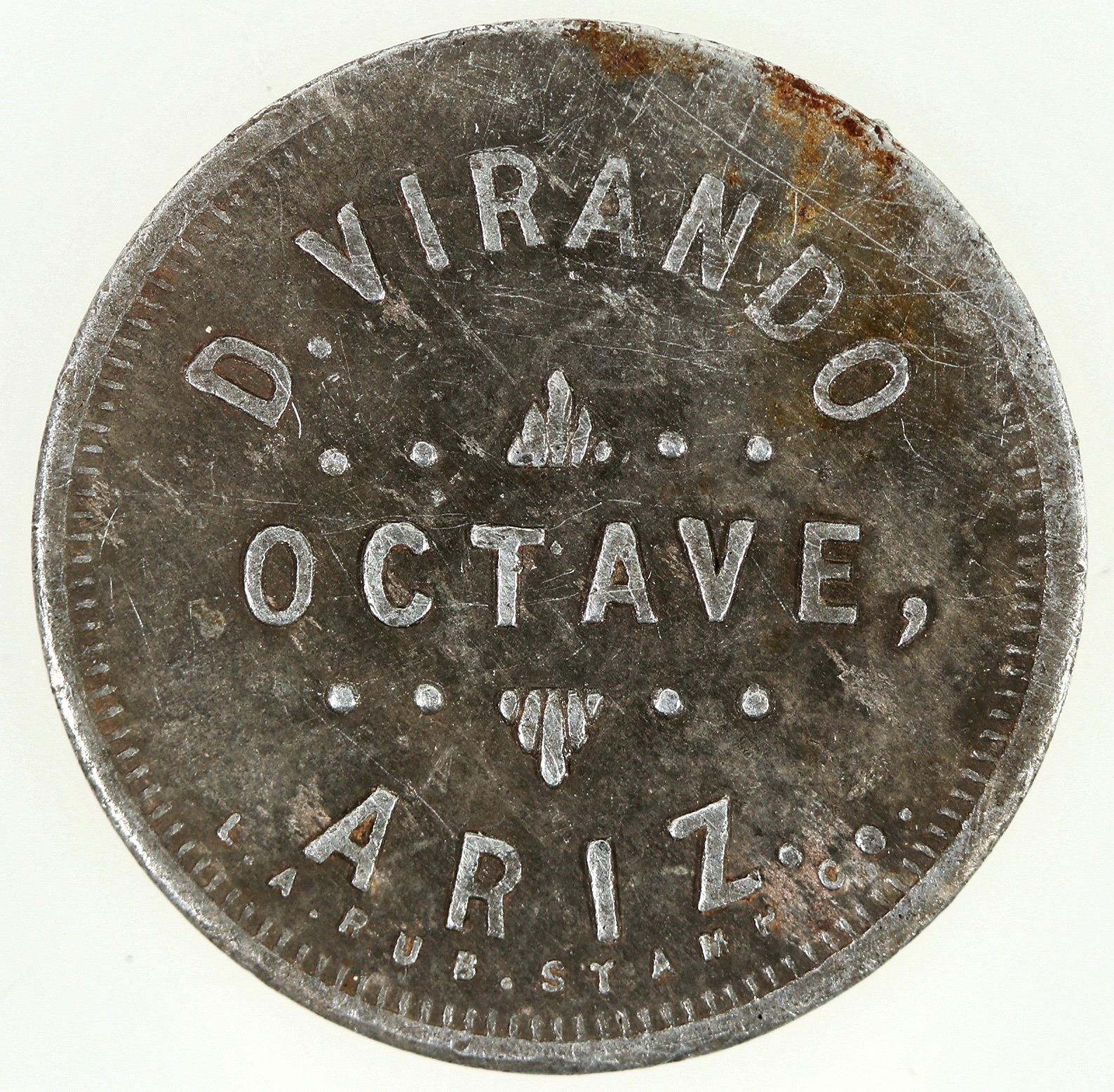Yavapai County town of Octave R 6 token: D. VIRANDO / OCTAVE, / ARIZ. / L.A. RUB. STAMP CO. //GOOD FOR / 12¬Ω / IN TRADE; Al, rd., 24 mm.