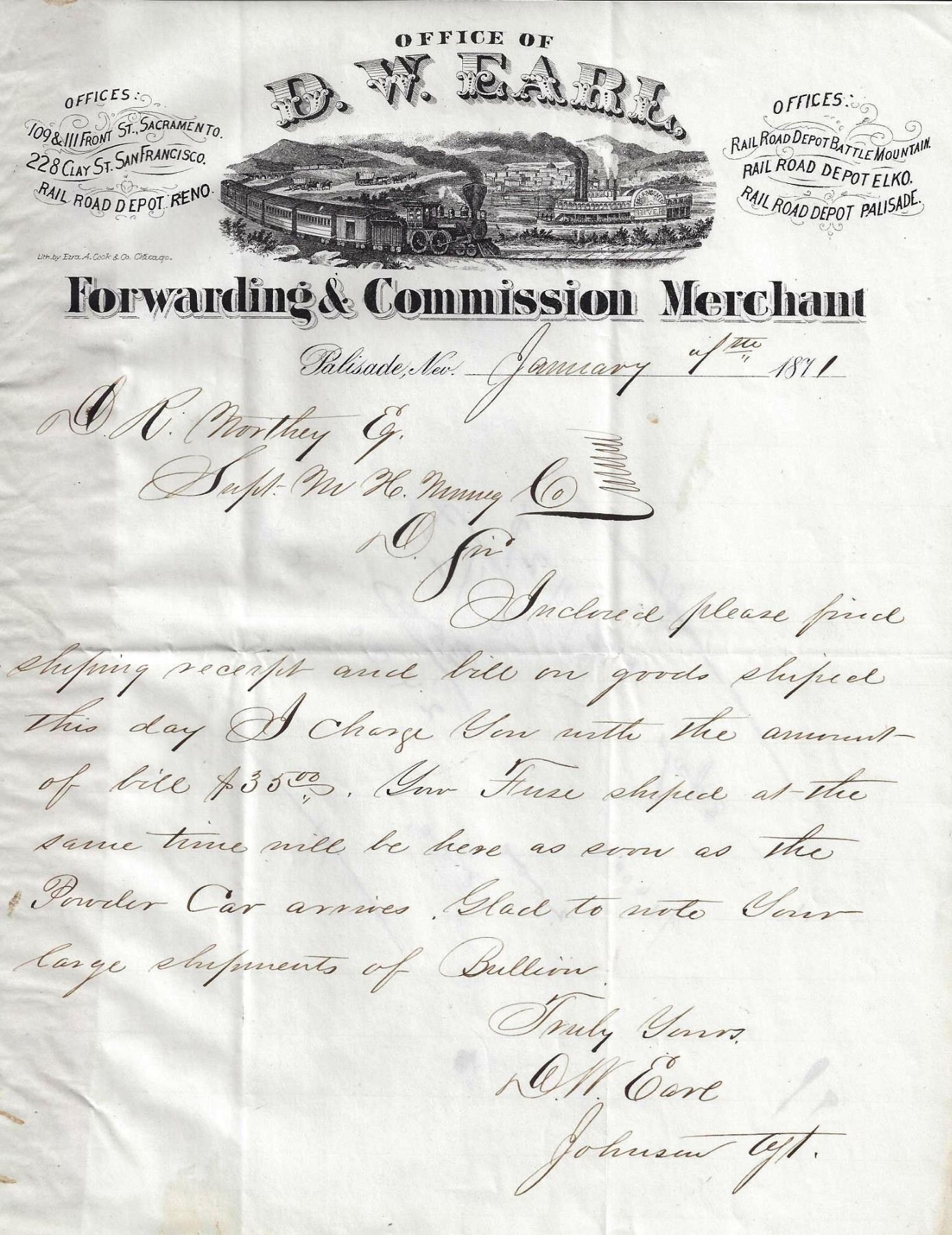 D. W. Earl was a Sacramento grain and flour dealer for California Gold Rush Towns. It wasn't long before they became a forwarding agent for those same towns with strings of wagons pulled by 10 to 18 mules. Earl was a very successful businessman and was an original stock holder for the Central Pacific Railroad in 1863. In 1868 when the CPRR crossed Nevada, Earl became their unofficial forwarding agent with offices inside the most important depots. Lot of four. 1) 1869 check to Earl signed by Henry Yerington. Check number 2. Has a 2c Nevada Revenue stamp. 2) Fancy 1871 pictorial Letterhead to the Mineral Hill Mining Company in Eureka County. "...will be here as soon as the Powder Car arrives." 3) Half sheet 1873 Battle Mountain letterhead. 4) Half sheet CPRR billhead for moving an item from Battle Mountain to Reno and on to Virginia City. 1876. Includes look at Earl's satellite offices in Nevada in the 1870's. State: Nevada City: Date: HWAC# 99792