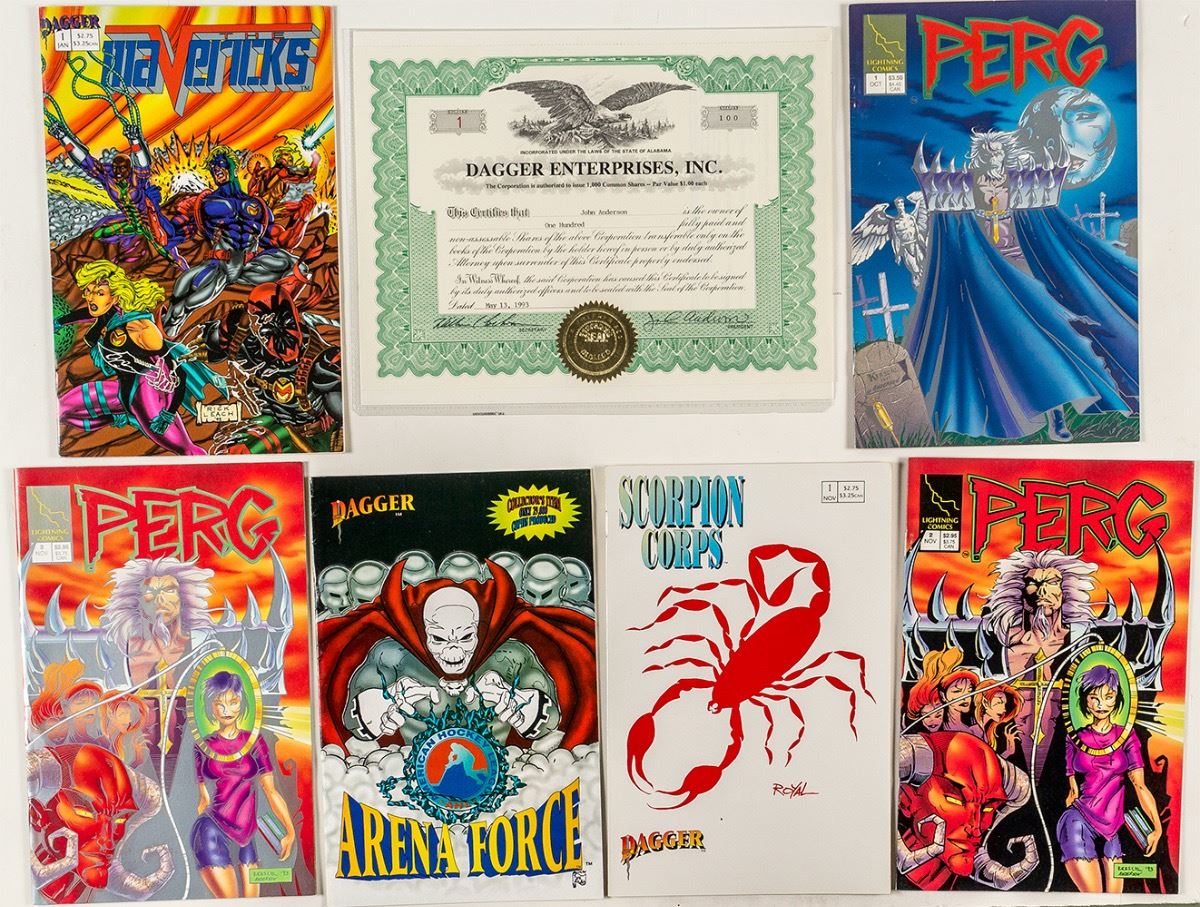 Certificate #1, issued to and signed by John Anderson, the company president. Comes with two issues of Dagger Comics, including Arena Force and Mavericks, and three issues of Perg under the Lightning Comics name. Ex. Condition. The company incorporated in Alabama in 1993 and dissolved in late 1994. Uncancelled. City: State: Alabama Date: 1993 hwac# 35416