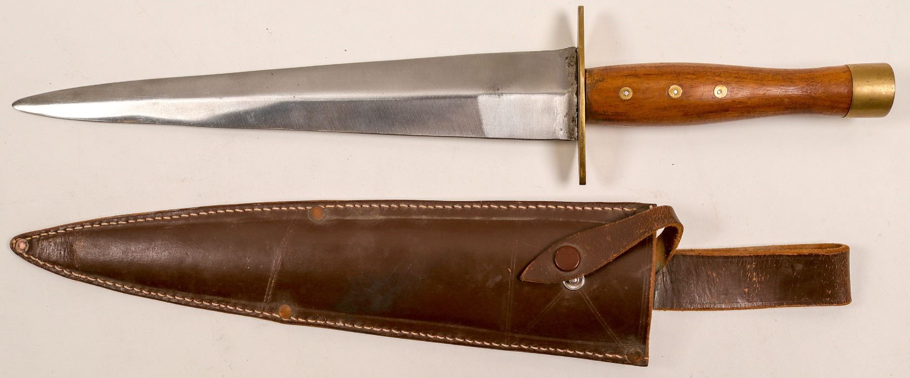 17" stainless steel double edge dagger with leather sheath. Brown wood handle, brass accents, unmarked and modern