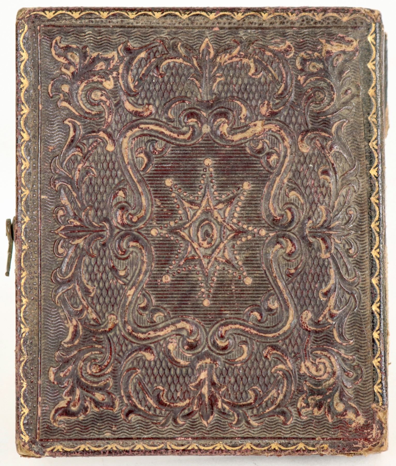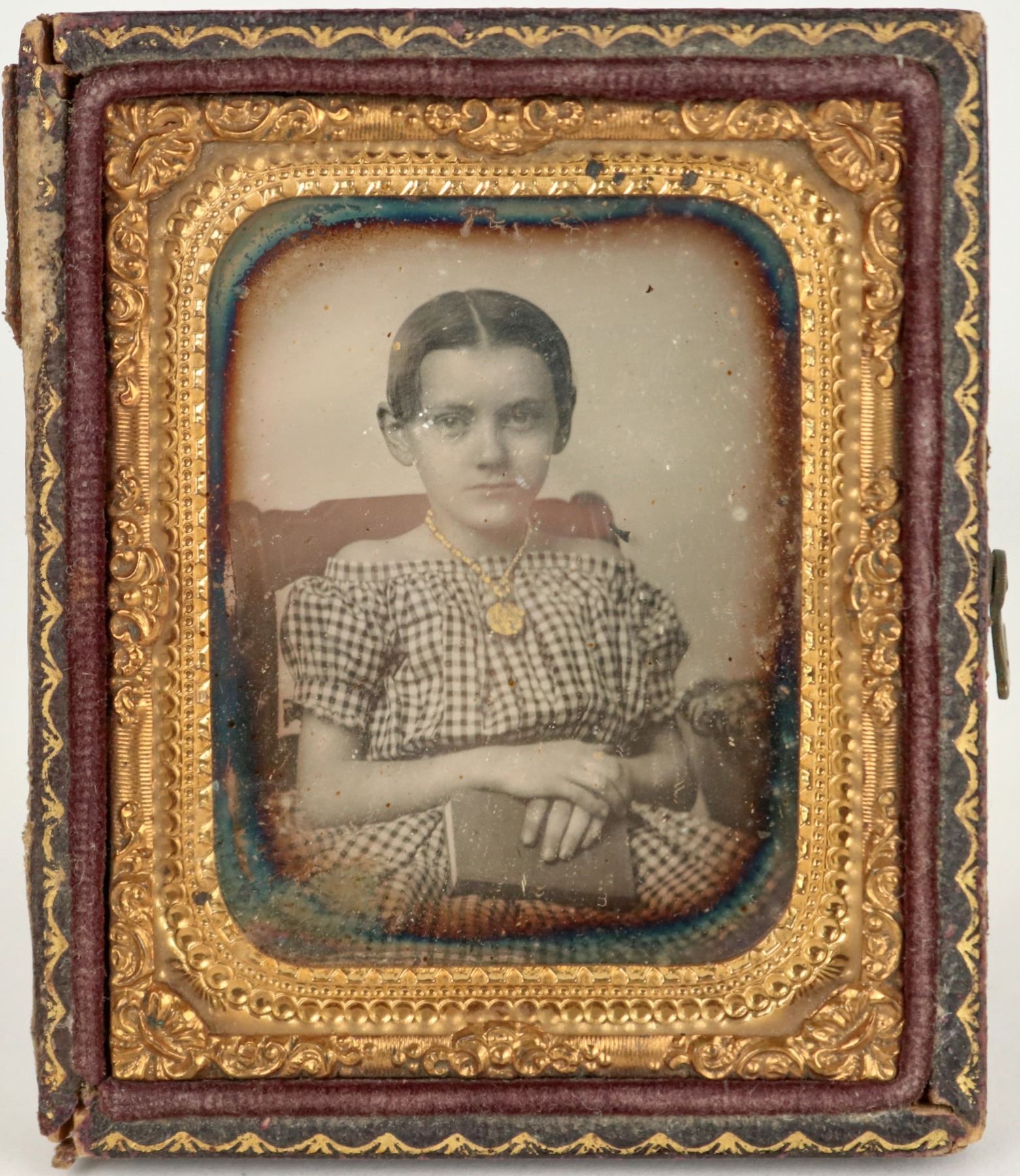Daguerreotype of a young girl in a gingham dress holding a book, wearing a colored gold necklace. Possible California Gold Rush era, c1850s. Gold gilt frame with tooled leather backing. One-half of the case is missing, but it retained the clasp/hook. Picture is about 1.5" x 2", frame is about 2.5" x 3". Beautiful piece.