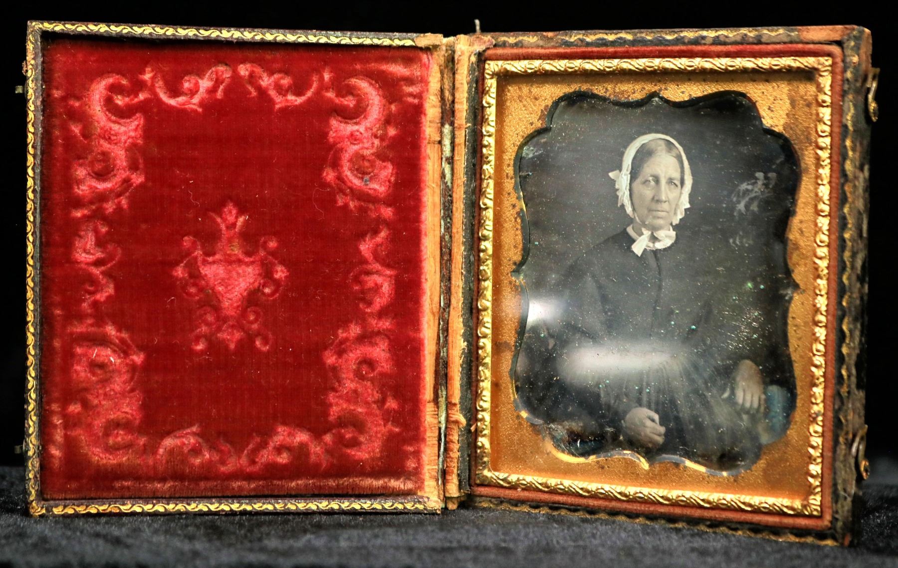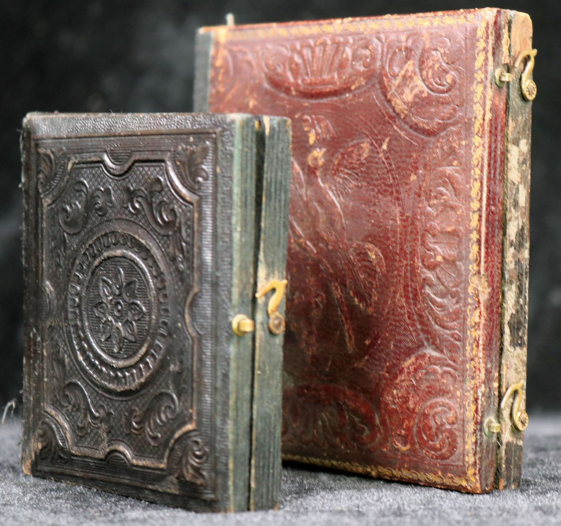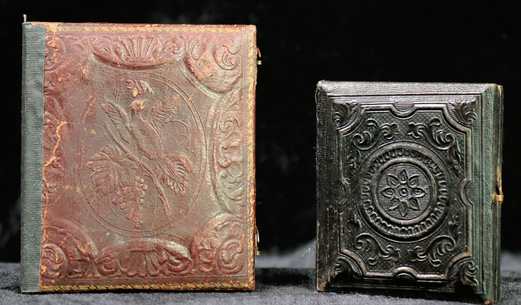 Two daguerreotypes, a 1/6 plate as well as a 1/9 plate. The larger shows a very stern woman, while the other is of a younger, more demure woman. Both in leather stretched on wood and in nice condition.