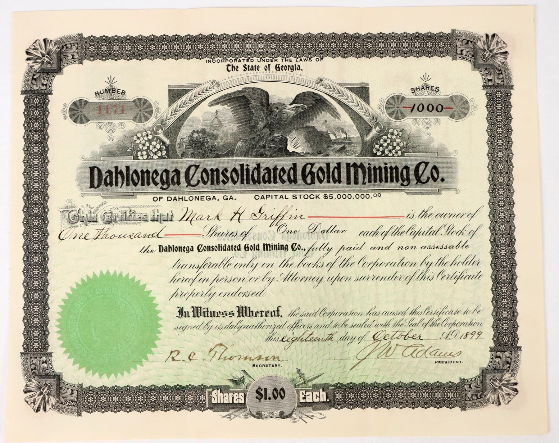 Inc. in Georgia. No. 1171, issued for 1000 shares to Mark Griffin in 1899. Signed by president JW Adams and secretary Thomson. Not cancelled. Eagle vignette. The Georgia Gold Rush was on. It was a placer mining party. And the Dahlonega Mine was at the center of the rush! But when the surface gold was all washed away, mining came to a standstill. After an interruption of operations at this mine site, a group of investors purchased about 7,000 acres of land around the discovery sight and formed the Dahlonega Consolidated Gold Mining Co. in 1895. The Consolidated constructed the largest stamp mill east of the Mississippi River (four-stories with 120 stamps). But the mine soon folded in 1906.The mine's lower workings became flooded and lay dormant until seventy-five years later, when the site came under new ownership. Consolidated Gold Mine is still open today for tours and mining! One of the major investors and stockholders in the Consolidated Gold Mining Company was Frederick Pabst - like in Pabst Blue Ribbon Beer. [georgiaencyclopedia.org and Wikipedia]