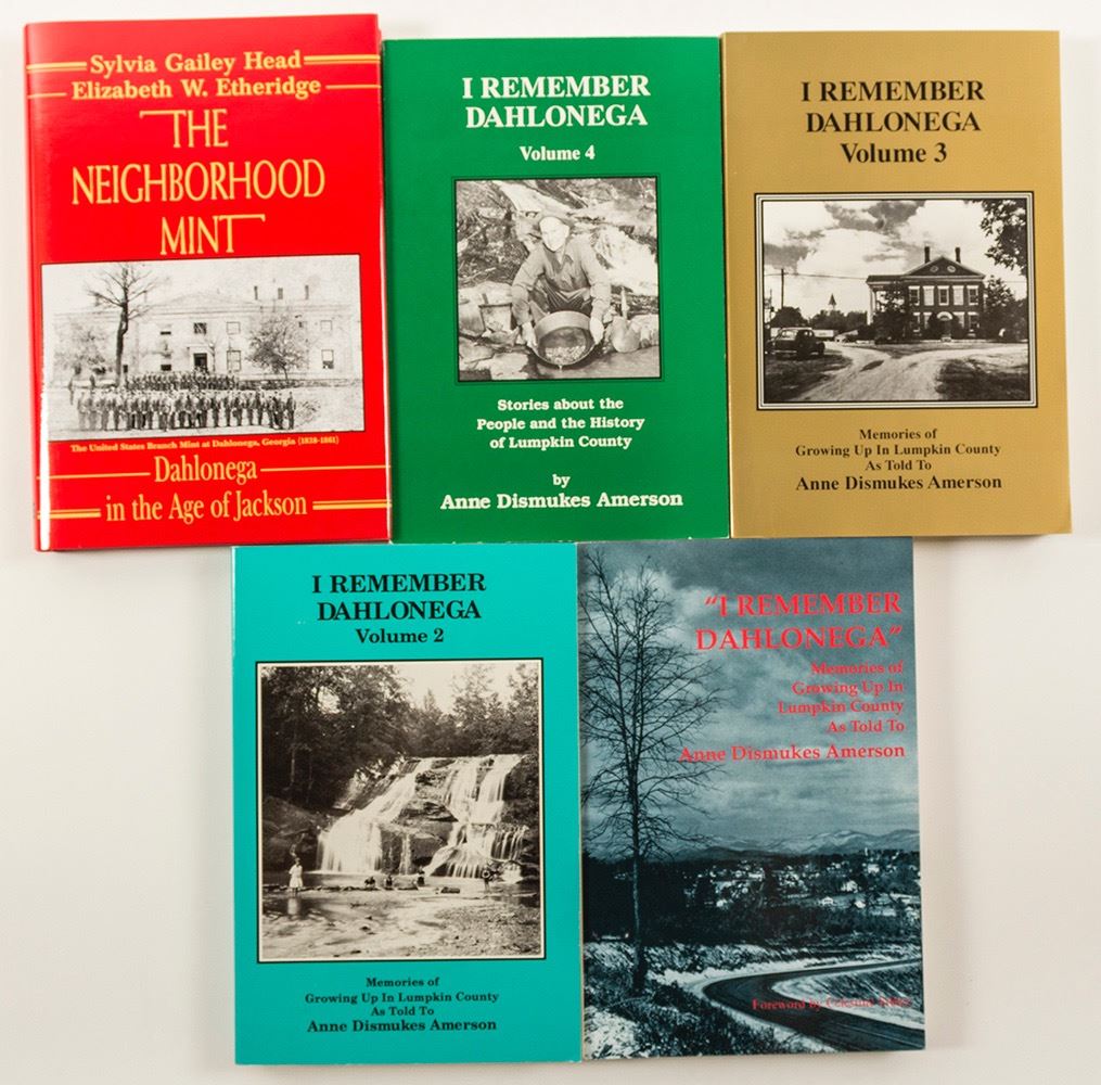 4 paperback books by Anne Dismukes Amerson; 4 Volumes, "I Remember Dahlongega" & a hardback book "The Neighborhood Mint" by Sylvia Gailey Head & Elizabeth W. Etheridge. 206 pp. Good condition. (Al Adams Gold Rush Memorabilia Collection) Date: Location: Dahlonega, Georgia HWAC# 57535