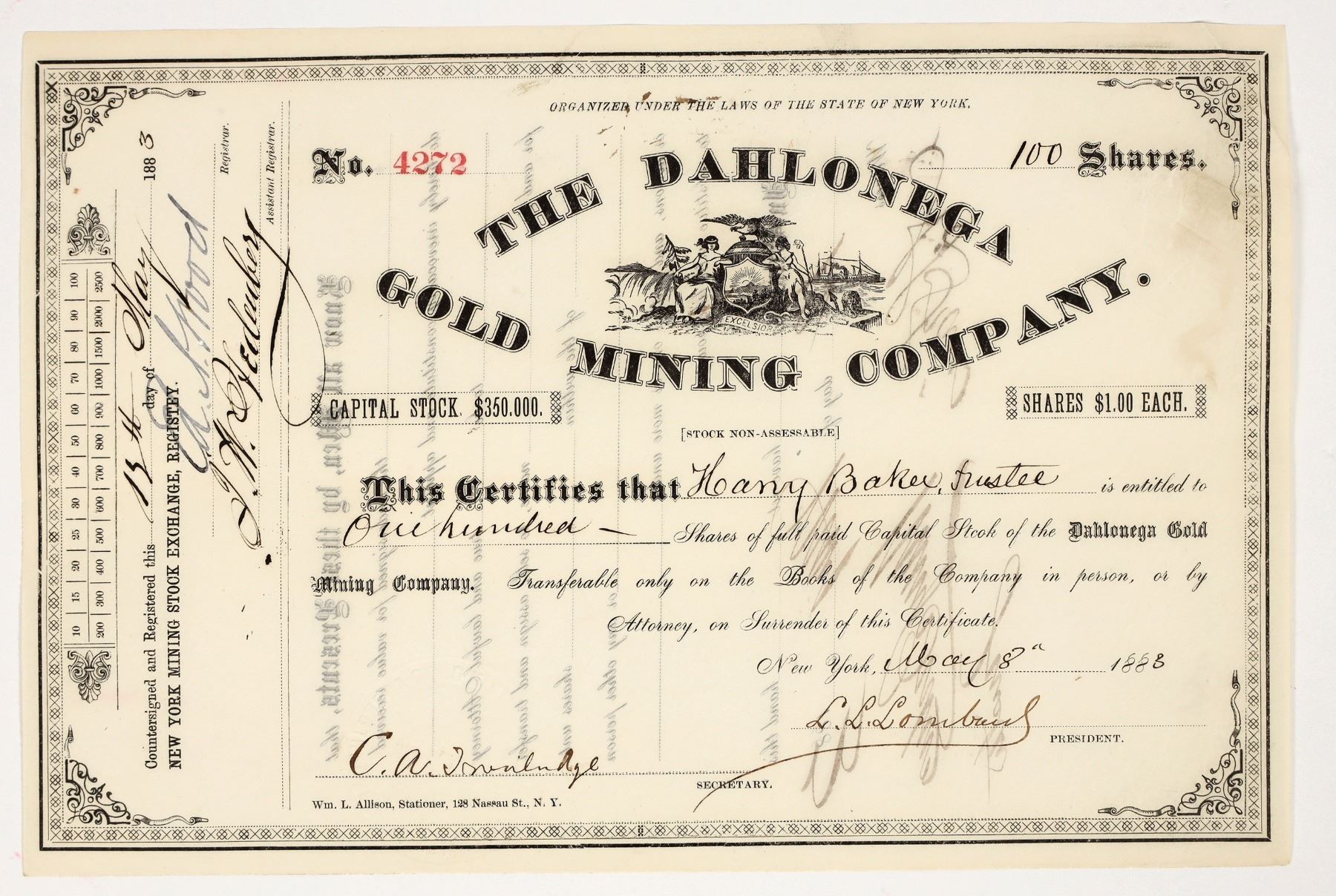 Number 4272 for 100 shares issued to Harry Baker in 1888. Signed by president Loring L Lombard and secretary Charles A Trowbridge. Not cancelled. "The property of the Dahlonega Gold Mining Company, formerly known as the Battle Branch Gold Company, consists of 80 acres of mineral land situated on the Etowah river about one mile from the village of Aurora, Georgia; water rights and power, including a dam across the Etowah, a race 750 feet in length and 21 miles of ditches for supplying their own and adjacent mines with water at all seasons; a splendid 10 stamp mill capable of crushing fifteen to twenty tons of ore per day; the Little Giant Hydraulic works which do the work of fifty men; and a tramway for transporting the ore from the mine to the mill. By the aid of their splendid water power the company is enabled to wash all the top dirt, and thoroughly expose the ledge cutting, a channel 100 feet wide by from 100 to 150 feet in depth, and saving every particle of gold in the sluice boxes." [United States Annual Mining Review and Stock Ledger, 1879] Loring L Lombard with Richard G Berford operated the Berford & Co. letter-carrying business beginning in 1851. Berford & Co.'s Express primarily served the West Coast of North, Central and South America. He was an early investor in the Croton mine on the Hudson River in 1863. In 1876 he was working his farm in Dover.