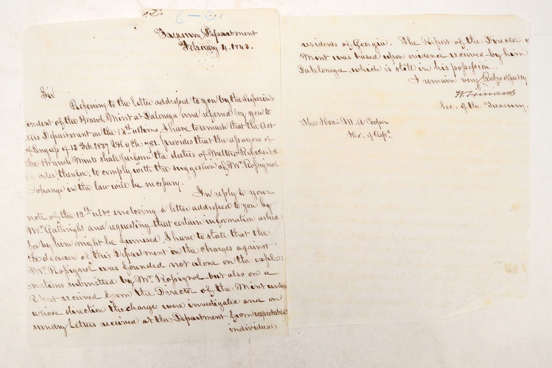 Two page letter from Walter Forward, Secretary of the Treasury to M (Mark). A. Cooper, "Hse of Reps." Feb 4, 1843. Mr. Forward is telling Congressman M. A. Cooper That the assayer of the Branch Mint shall perform the duties of melter and refiner, as required by law. Dahlonega Mint Superintendent Rossignol has apparently requested an additional person in charge of melting and refining, and The Treasury Dept has said "no", and it would require a "change in the law." That requested change was later made standard procedure by the Mint.
