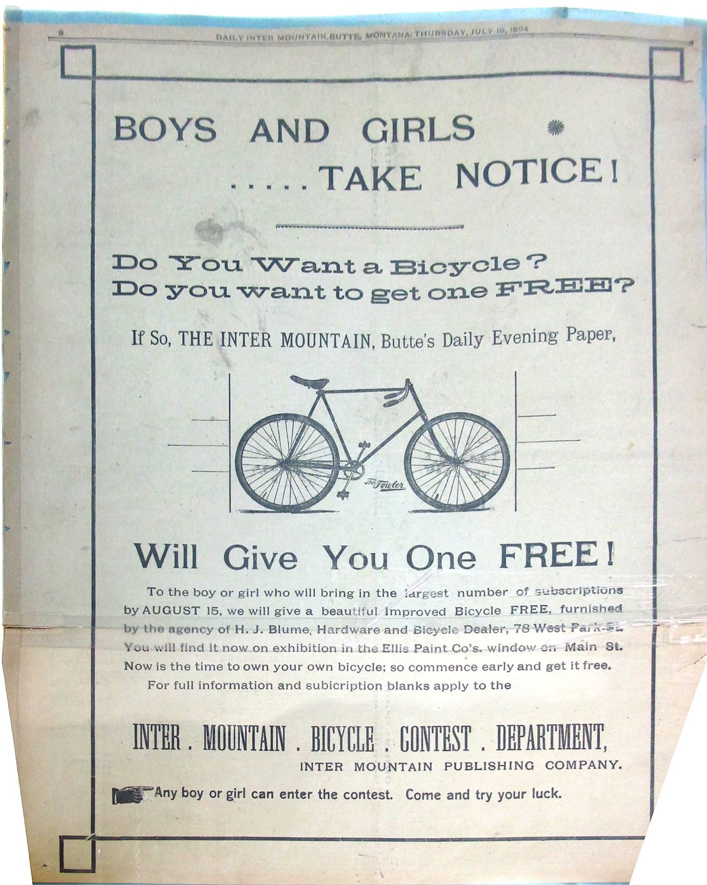 July 19, 1894 Daily Inter Mountain newspaper partial edition. Full page ad for a bicycle give away by Daily Inter Mountain. Large horizontal tear, still suitable for display. State: Montana City: Butte Date: 1894 HWAC# 86431