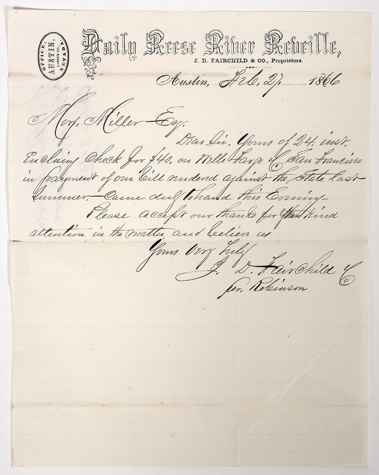 JD Fairchild & Co., proprietors. Austin, Feb. 27th, 1866. Message is to Maj. Miller, esq., regarding a Wells Fargo check payment to the state. Signed by JD Fairchild (per Robinson). 10 x 7.5" Folds. Fairchild came to California during the Gold Rush (1854) and worked in El Dorado and Sierra Counties before heading to Austin in 1863 during the Reese River Rush. He purchased the Reveille with his brother.