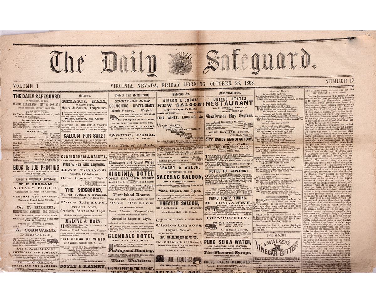 Friday Edition, Vol. I, No. 17. Very rough condition. The Daily Safeguard first published on October 5, 1868. The paper was a political voice for the Democrats during the campaign of 1868. Three months after the election, the Daily Safeguard was suspended (February 1, 1869). Ultra rare. [Lingenfelter, Richard E. and Karen Rix Gash. The Newspapers of Nevada: A History and Bibliography 1854-1979. Reno: University of Nevada Press, 1984. p. 260]