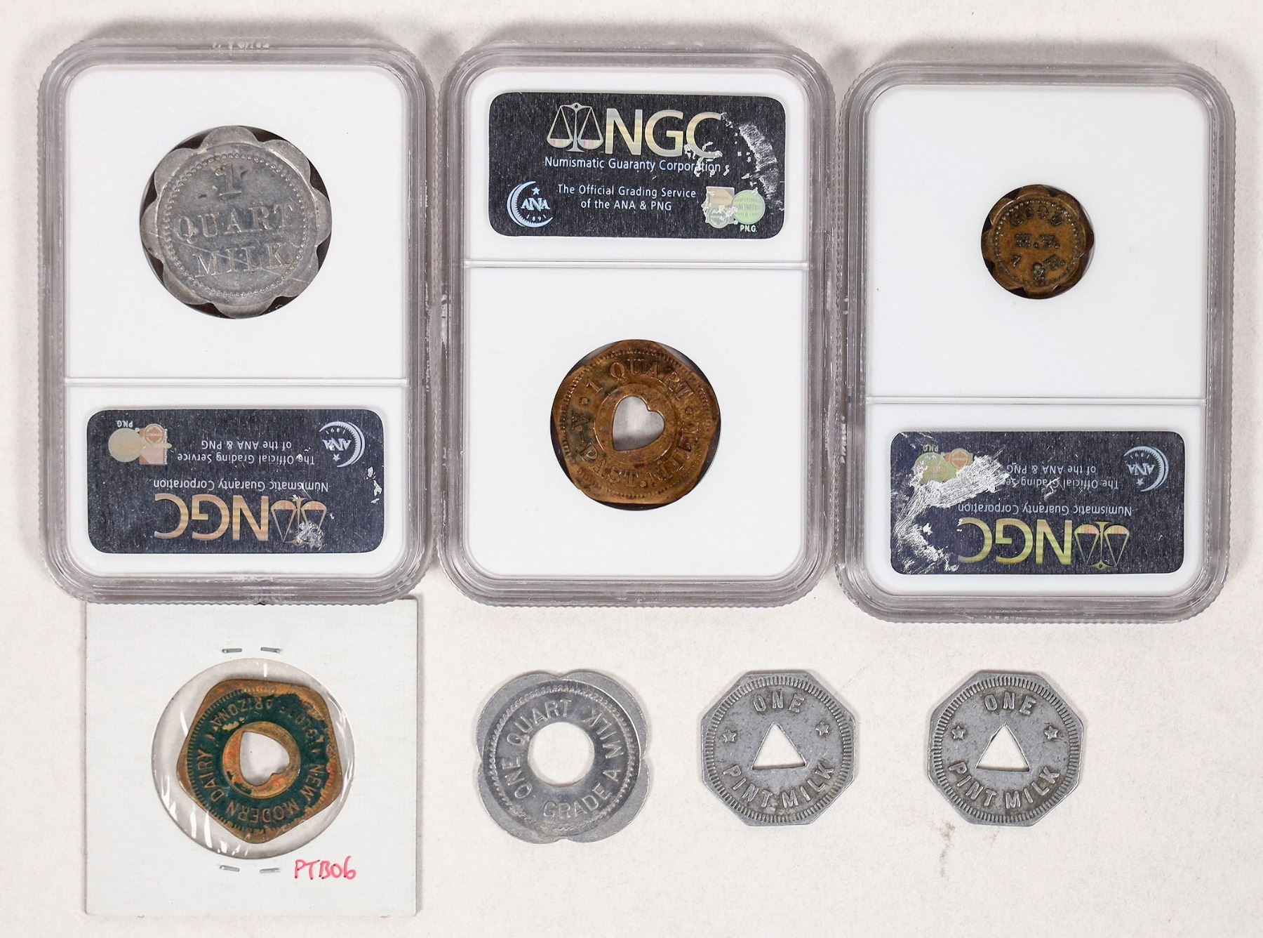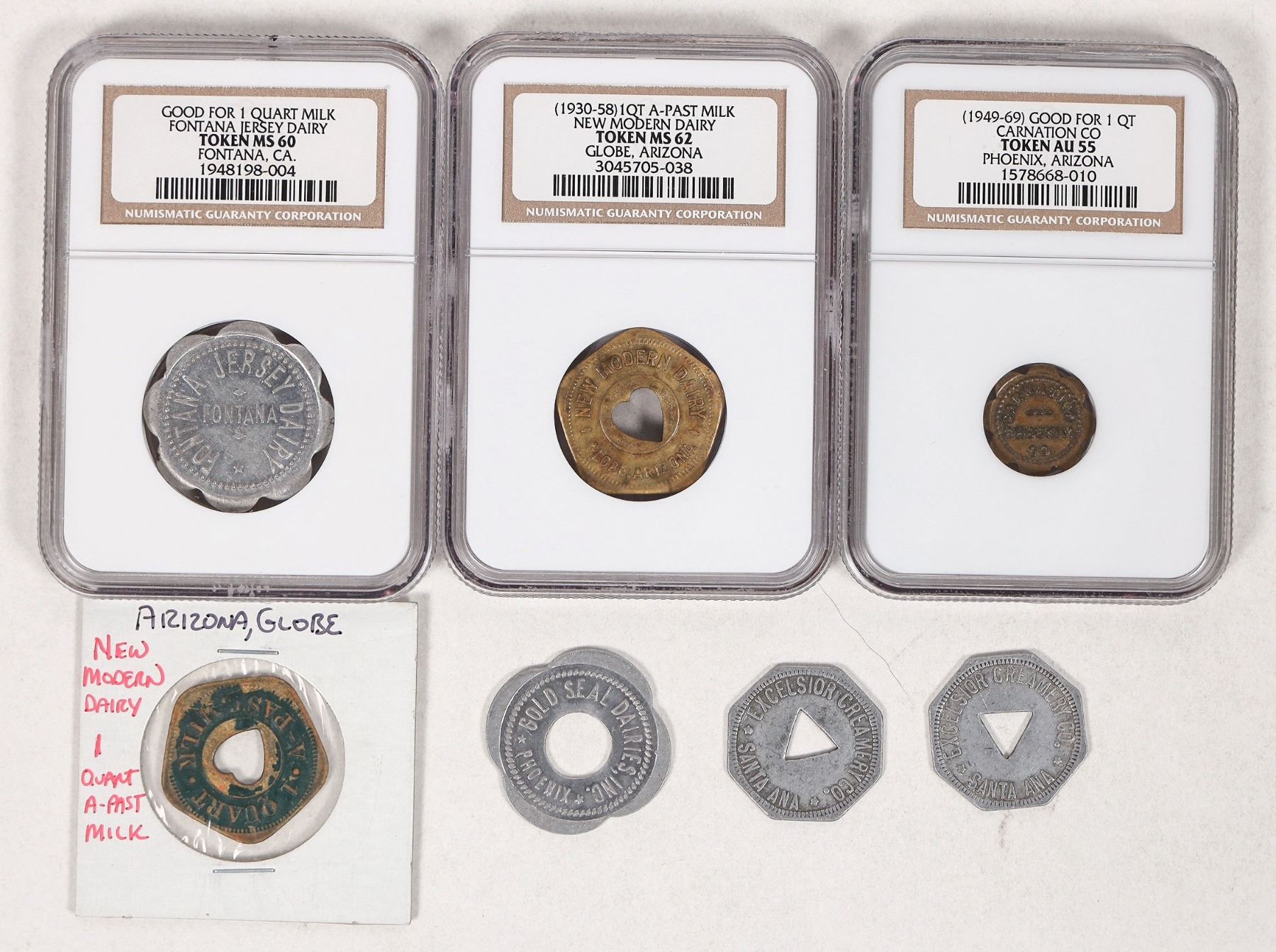 Lot of seven tokens from dairies: three are certified: 1) NGC MS 62: New Modern Dairy, Globe, Arizona; 2) NGC AU 55: Carnation Dairy, Phoenix, Arizona; 3) NGC MS 60: Fontana Jersey Dairy, Fontana, California. Four raw tokens: New Modern Dairy, Globe, AZ; Gold Seal Dairies, Phoenix, AZ; Excelsior Creamery Co., Santa Ana, CA (2).