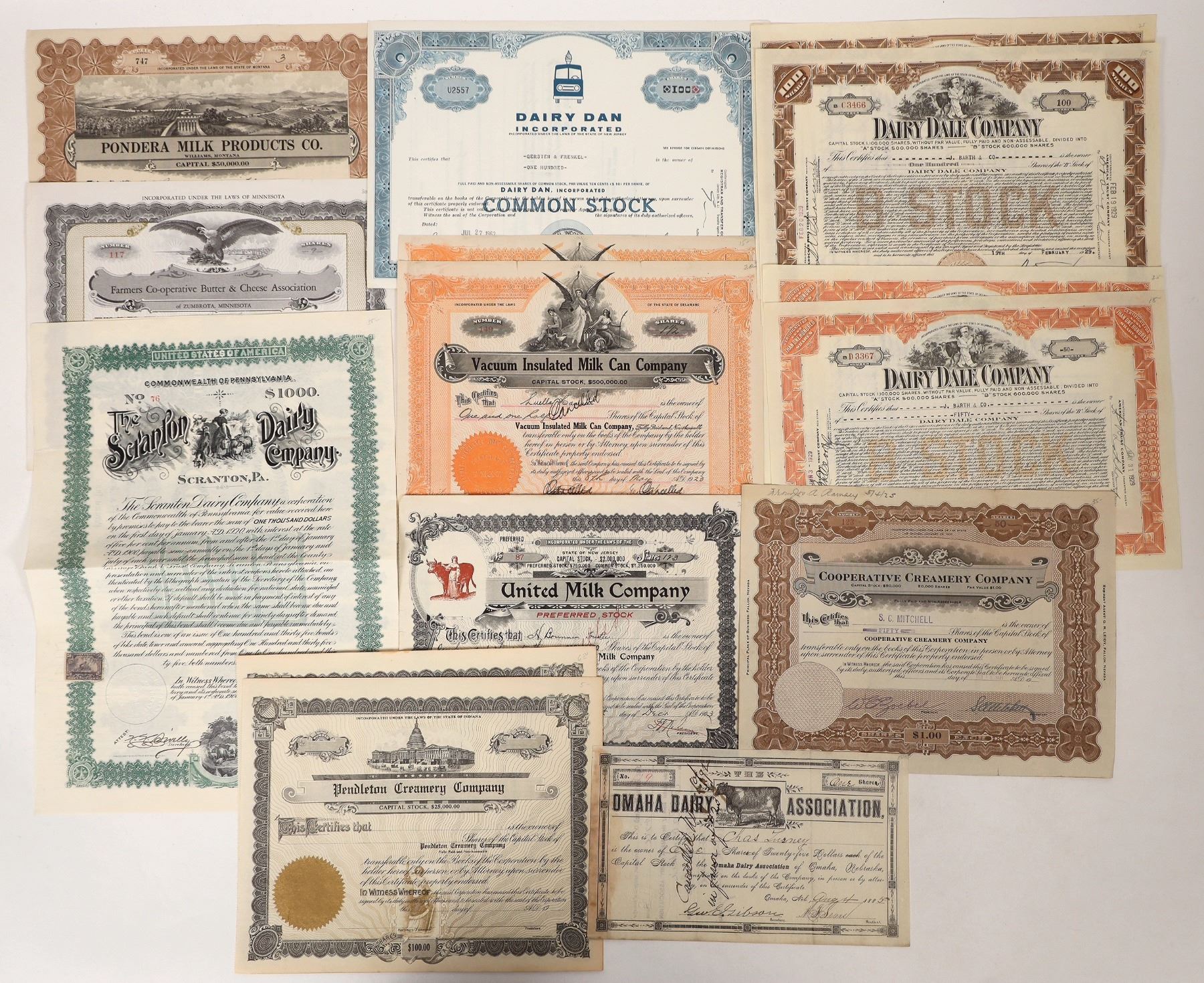 Dairy stock certificates include Cooperative Creamery Company 1921, Omaha Dairy Association 1885, United Milk Company 1903, The Scranton Dairy Company 1900, Dairy Dale Company 1929 and more. All are in decent condition. Please see photos for more details.