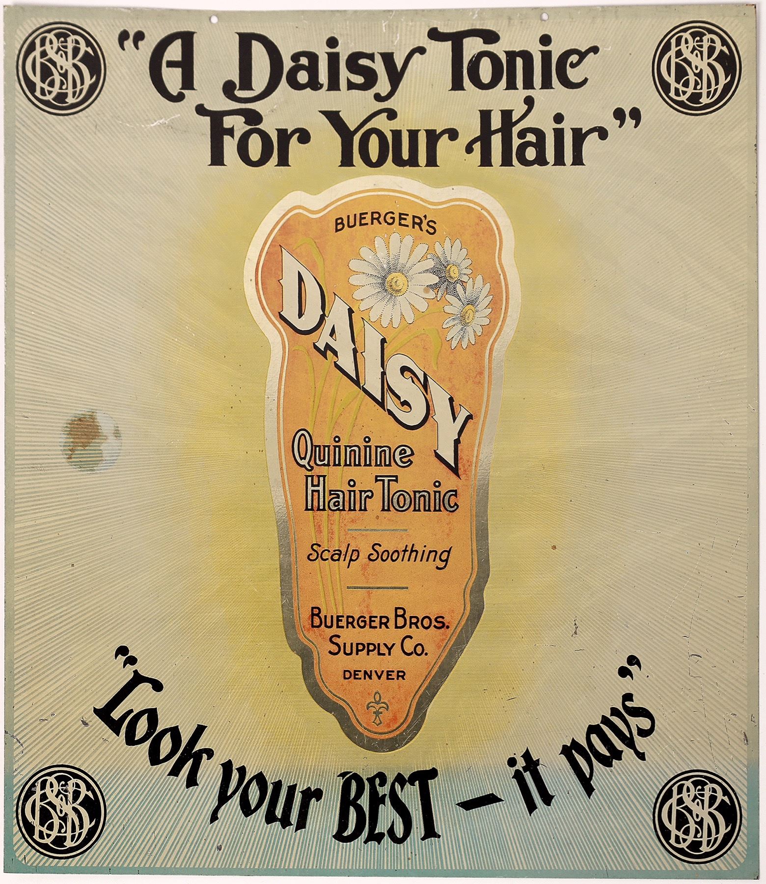Metal sign for "Daisy Quinine Hair Tonic" produced by Buerger Bros. Supply Co., Denver. This advertising sign reads, "A Daisy Tonic For Your Hair" and "Look your BEST- it pays." Very nice advertising sign with the hair tonic label in the middle, and the Buerger Bros. logo in all for corners. Approx. 9 x 10 inches, good condition.