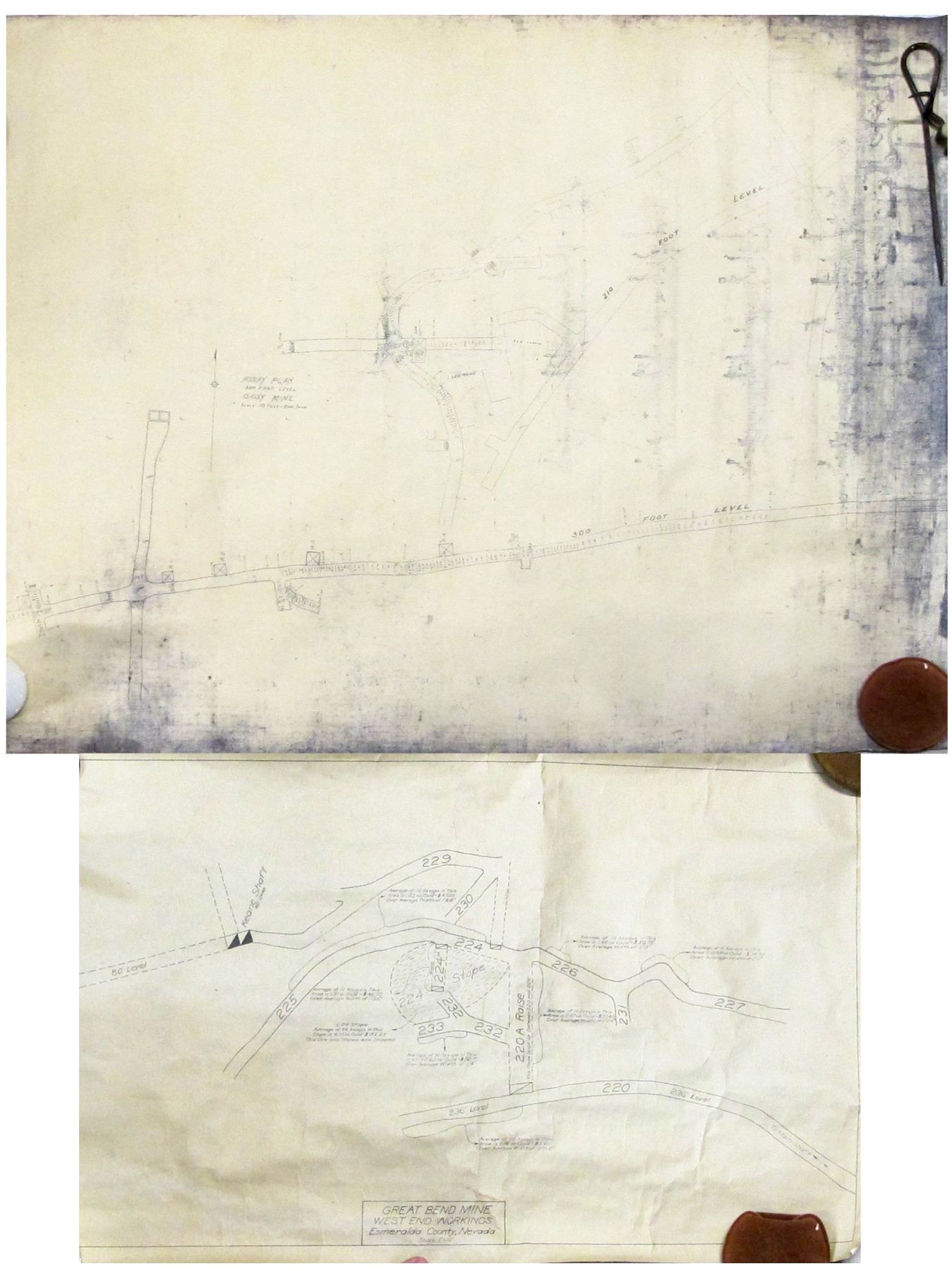 Two blueprints of assays on these mines. The Daisy map is about 36 x 48" showing the assays of the 300 level. 1"=10'. No title block. The assays appear to be in dollars. There are various and numerous high grade streaks of plus-one ounce material, which were probably mined out after this map was made. The second map is of the Great bend Mine, at a scale of 1"=10', about 24 x 36". Again, numerous pay zones of plus-one ounce are identified.