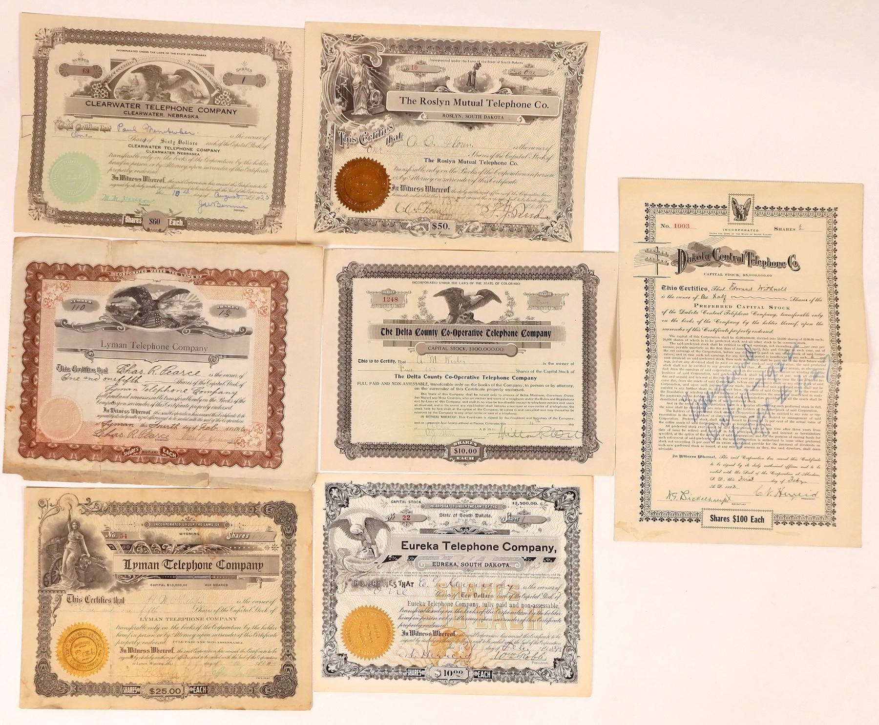 Lot of 7 different. Includes: Delta County Co-Operative Telephone Co. (Paonia, Colorado, 1914); Dakota Central Telephone Company (1922); The Roslyn Mutual Telephone Co. (South Dakota, 1915); Lyman Telephone Company (Wyoming, 1914 and 1916); Clearwater Telephone Co. (Nebraska, 1925); and Eureka Telephone Co. (South Dakota, 1898).