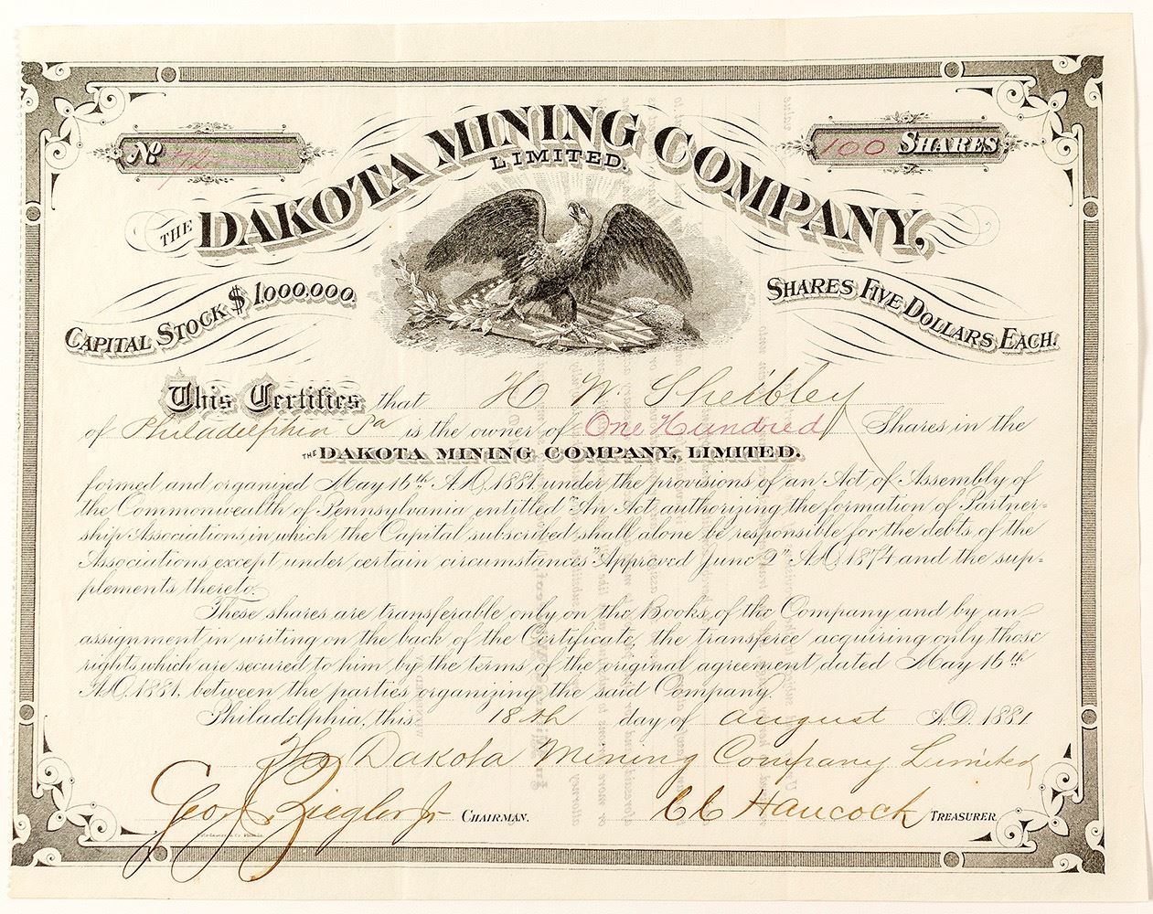 Stock certificate for the Dakota Mining Company Limited, a mining company part of the black hills gold rush. Rare pictorial mining stock with an eagle on the front. Fabulous condition, issued in 1881, un-cancelled. Date: 1881 Location: South Dakota HWAC# 40441