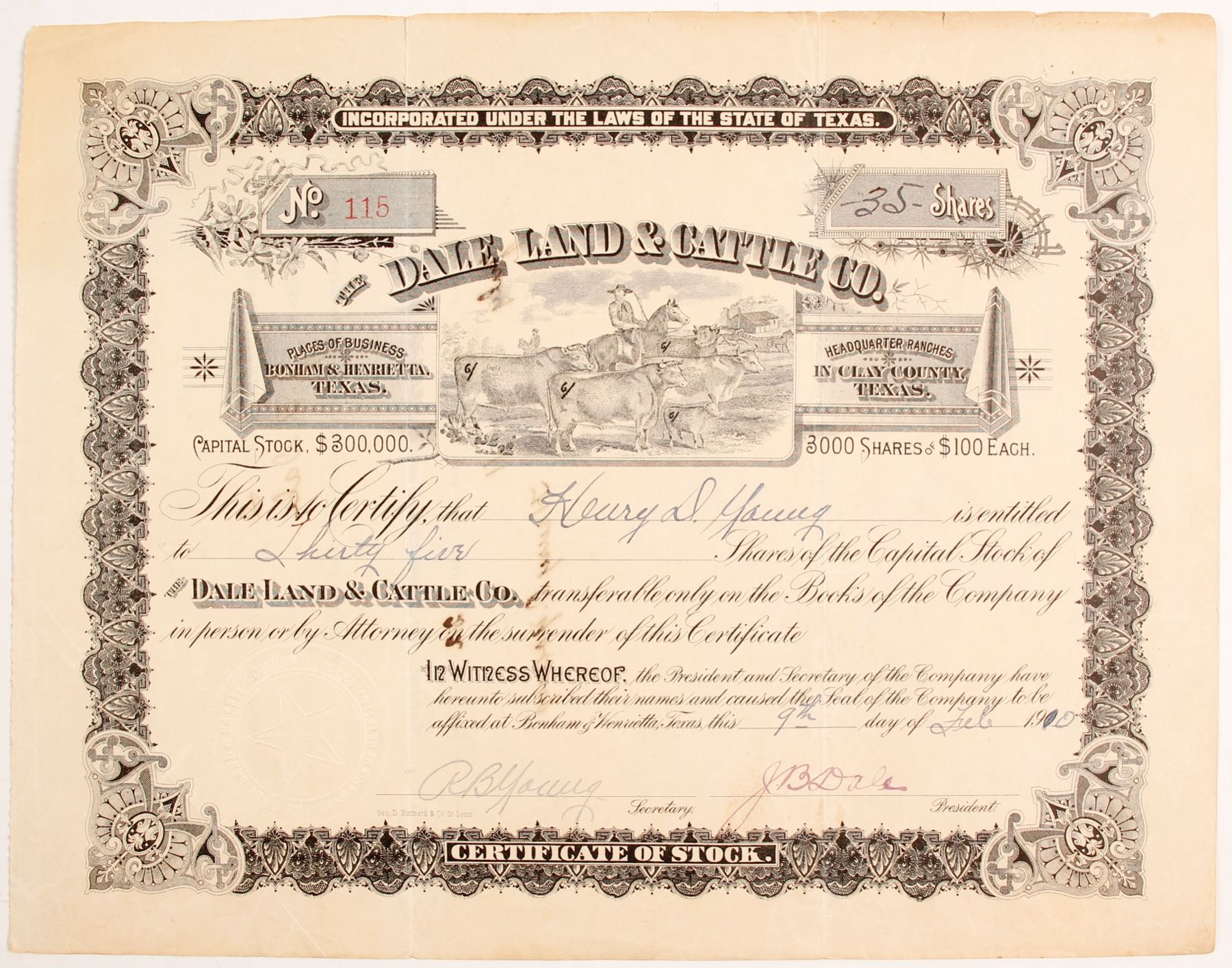 I/U #115 35 shares Henry ? 1910 signed by President Dale. Cattle vignette. Ink bleed thru, creases, worn edges. Still operating in Orange Grove, TX. Prag Collection. State: Texas City: Date: 1910 HWAC# 83259